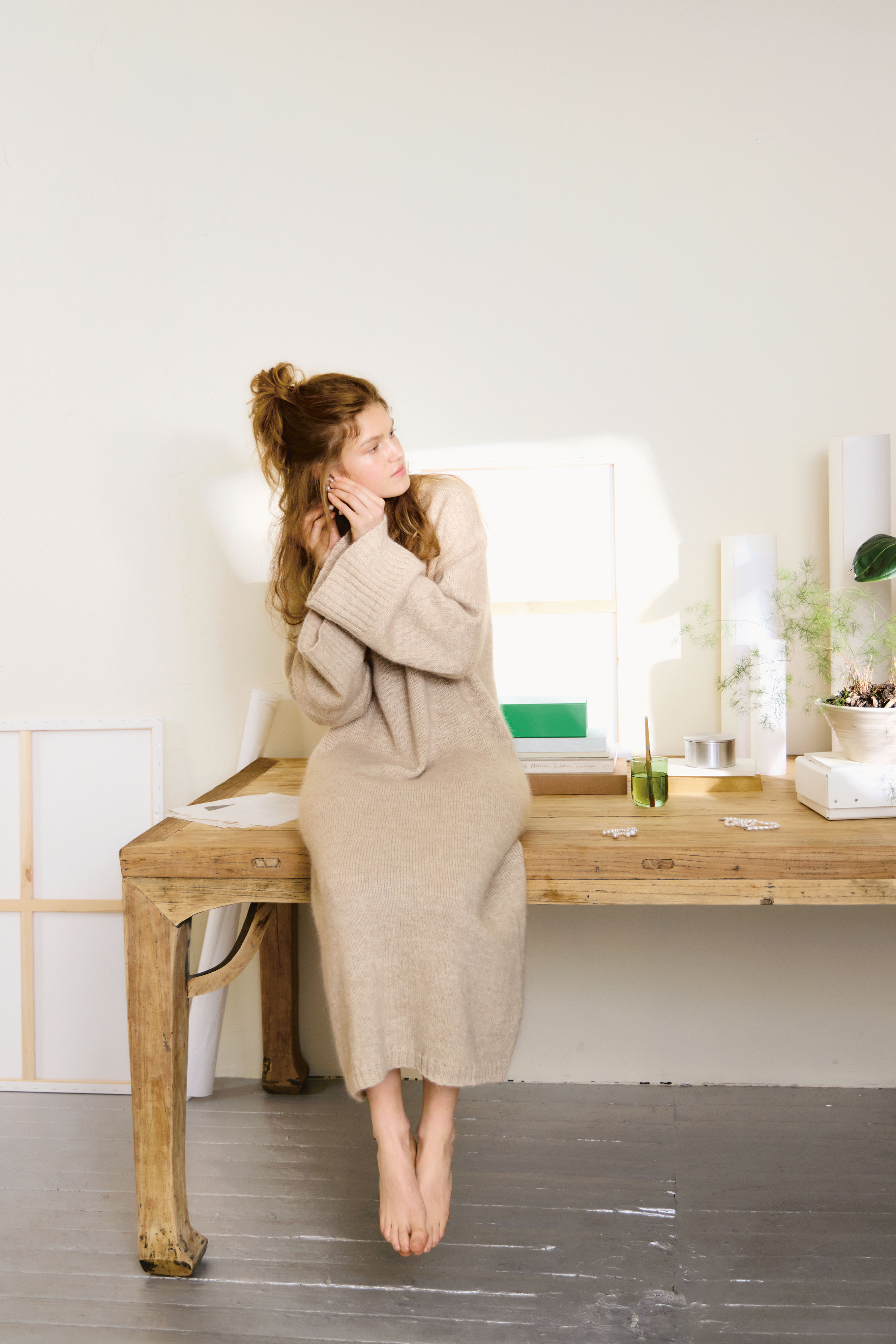 Halskanten strikkes til slutt i vrangbord og brettes dobbel mot vrangsiden.