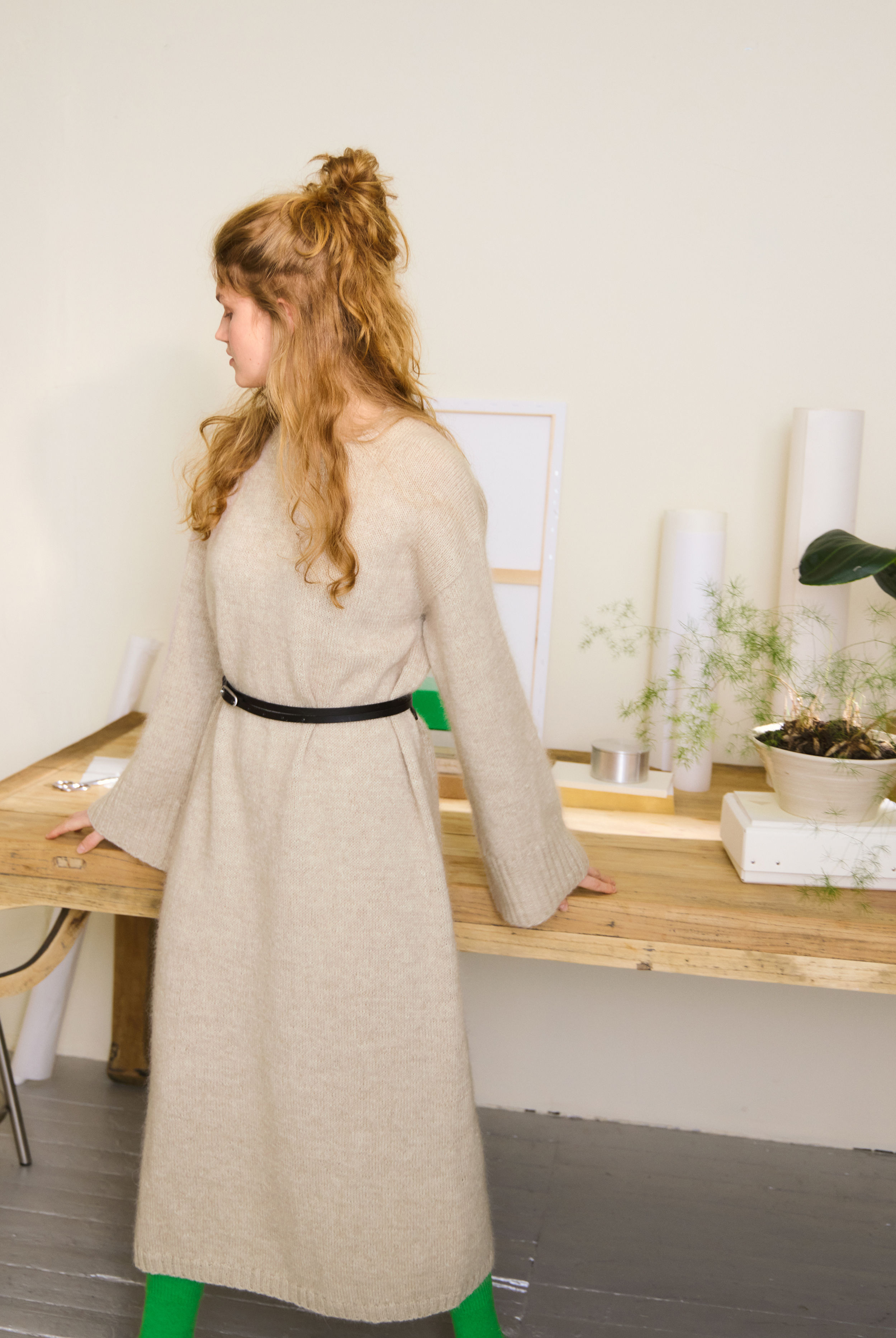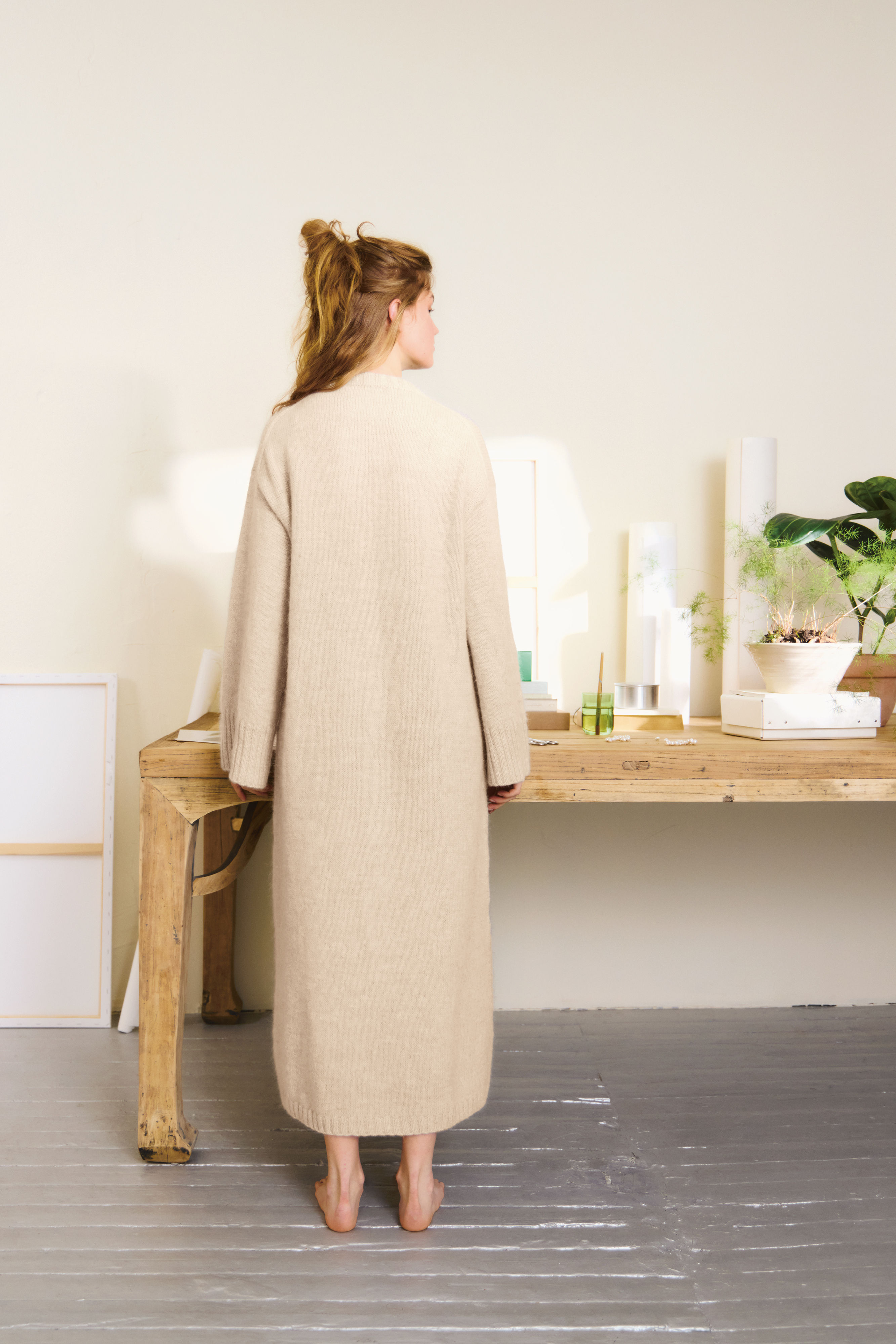 Forstykke strikkes sammen til ett forstykke og strikkes ned til under ermene, før forstykket strikkes sammen med bakstykket. For- og bakstykket strikkes rundt i glattstrikk samtidig som det økes jevnt nedover i hver side, før det avsluttes med en vrangbord.