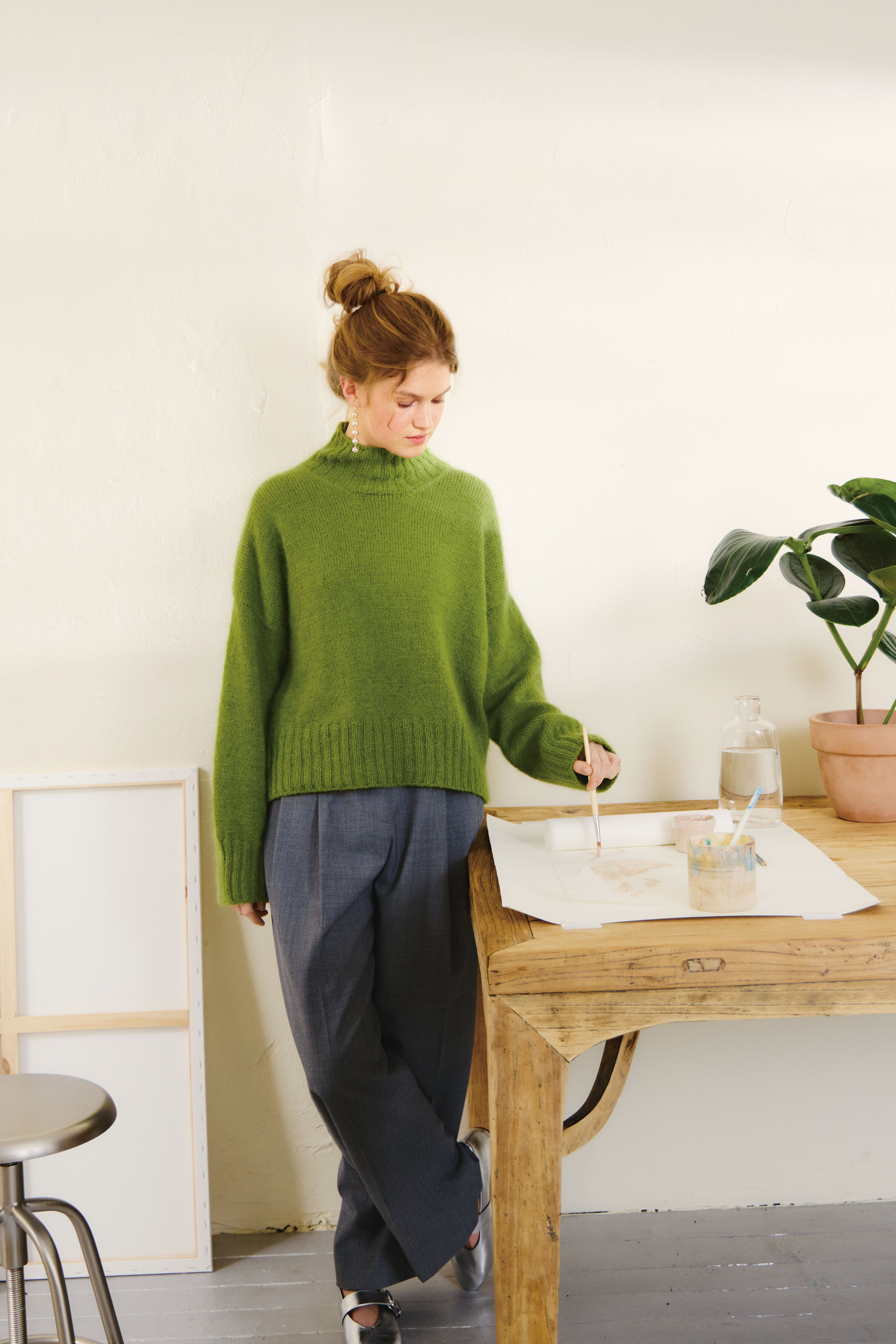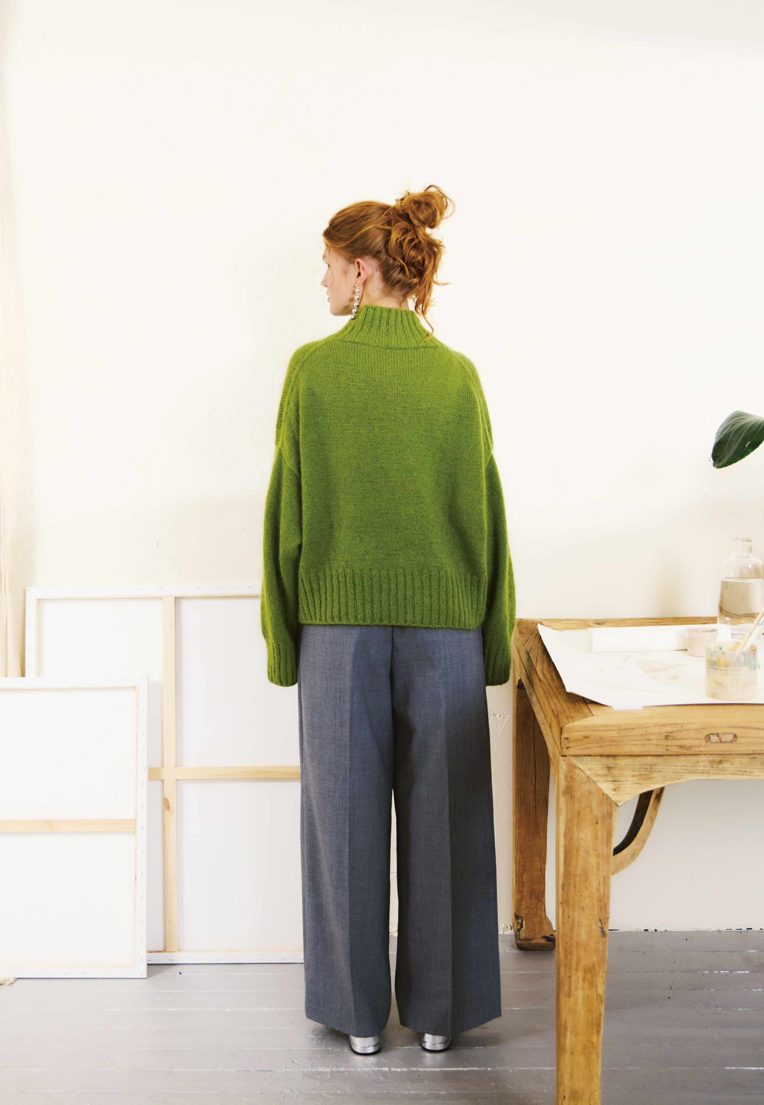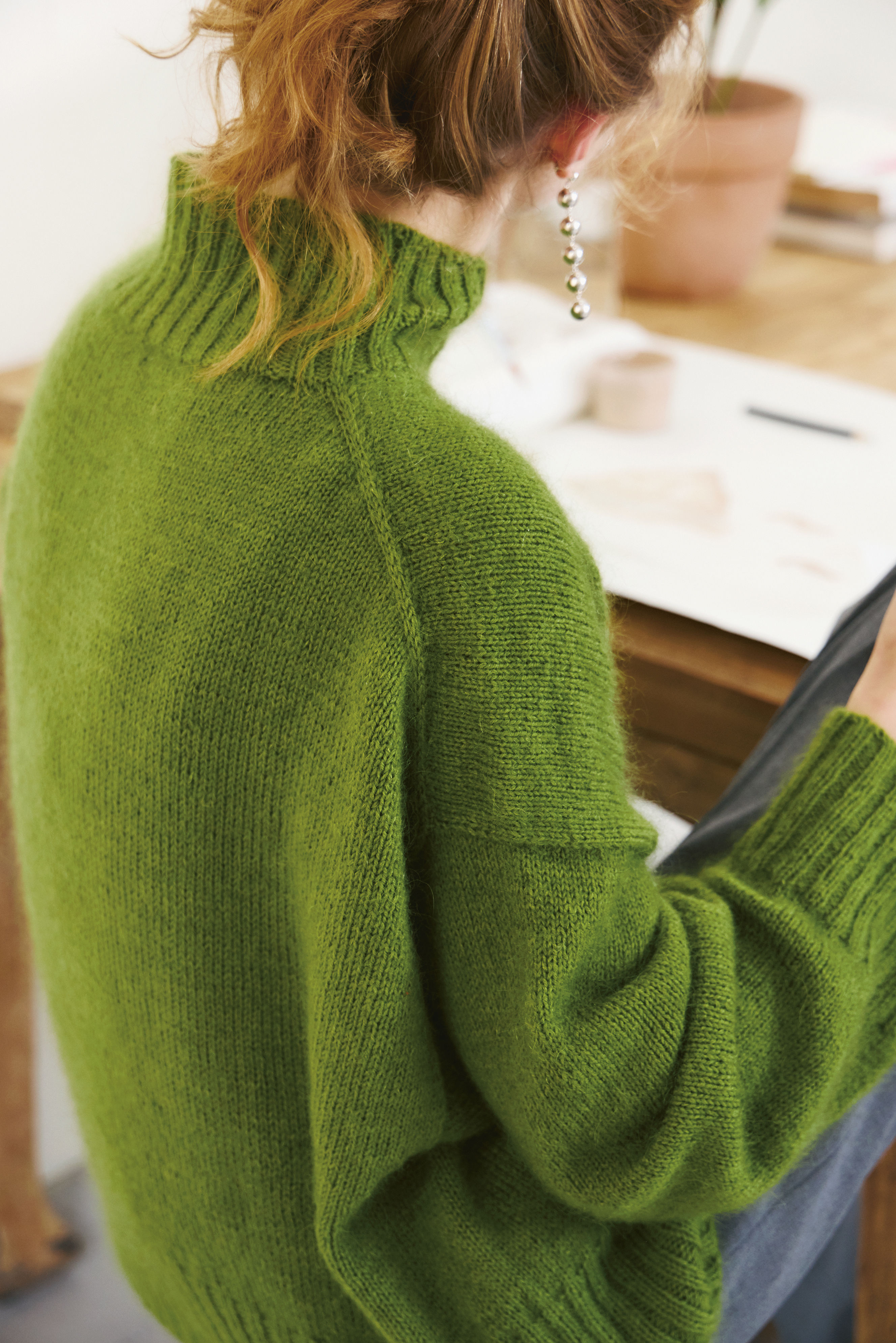 Det plukkes opp masker til ermer, som strikkes rundt i glattstrikk med fellinger nedover ermet, før det avsluttes med en vrangbord.
