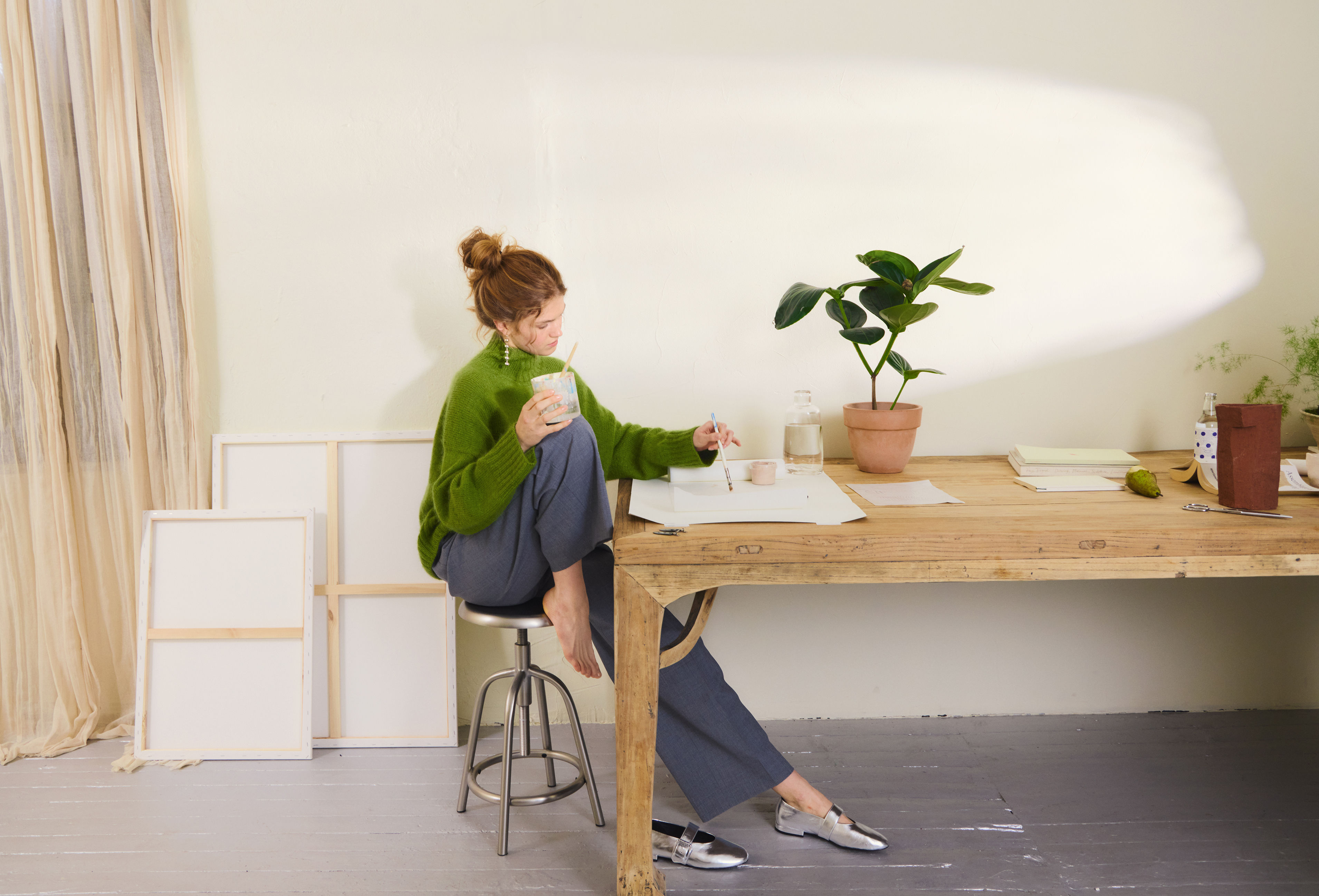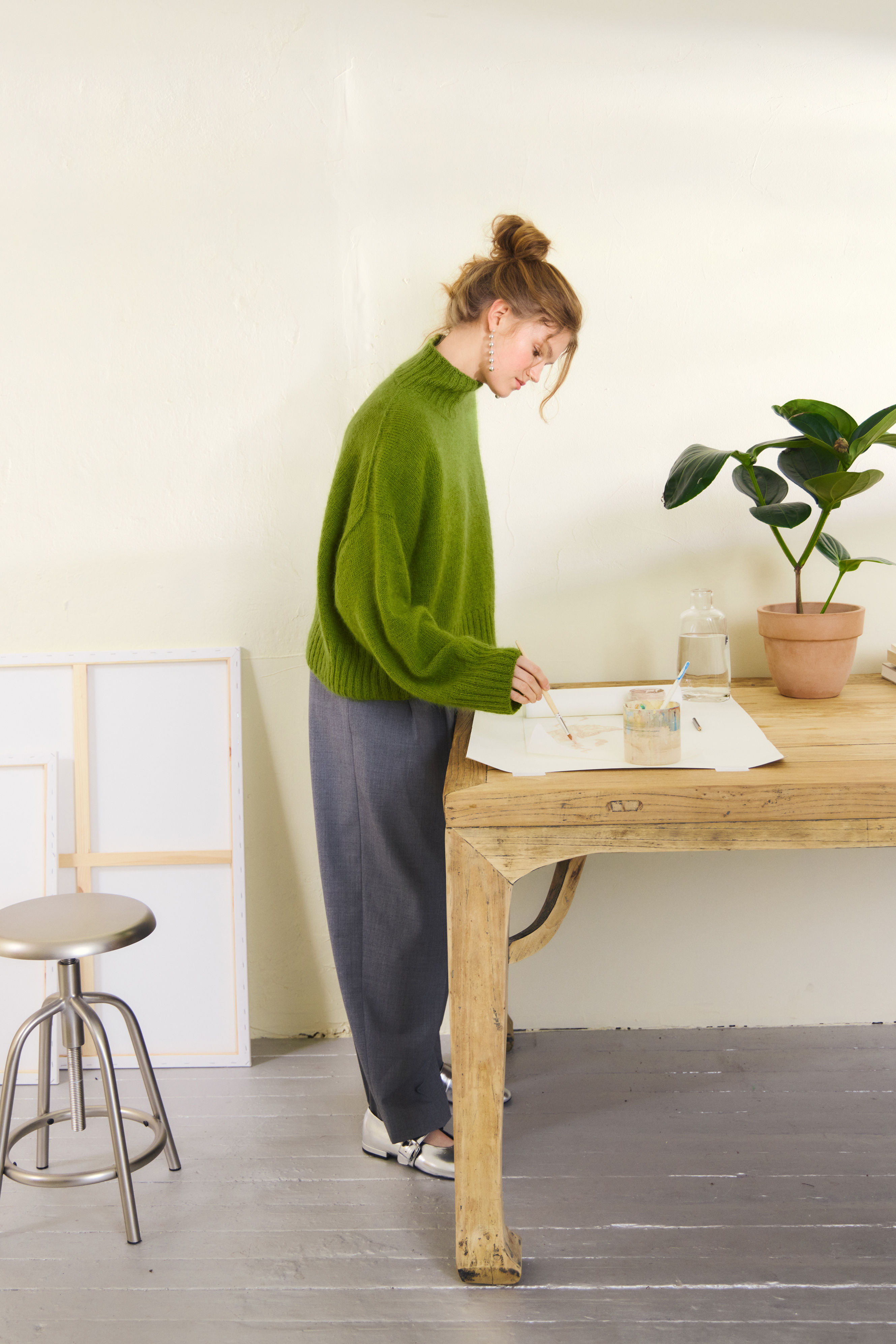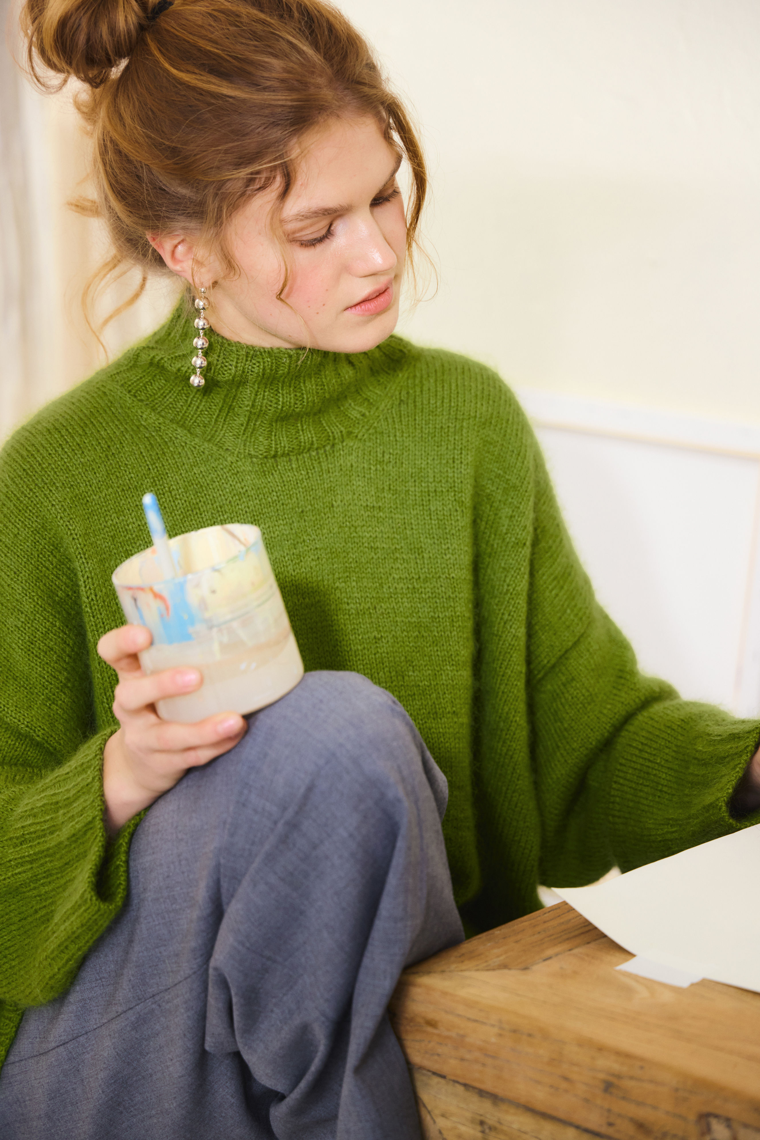 Det plukkes opp masker til ermer, som strikkes rundt i glattstrikk med fellinger nedover ermet, før det avsluttes med en vrangbord.