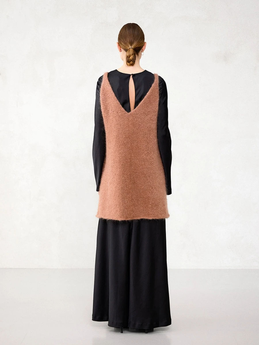 Først legges det opp masker til høyre og venstre bakstykke, som strikkes hver for seg med økninger til v-hals og ermehull. Deretter strikkes høyre og venstre forstykke på samme måte, før arbeidet tas sammen. Skjørtet strikkes rundt i glattstrikk, med økninger i sidene.