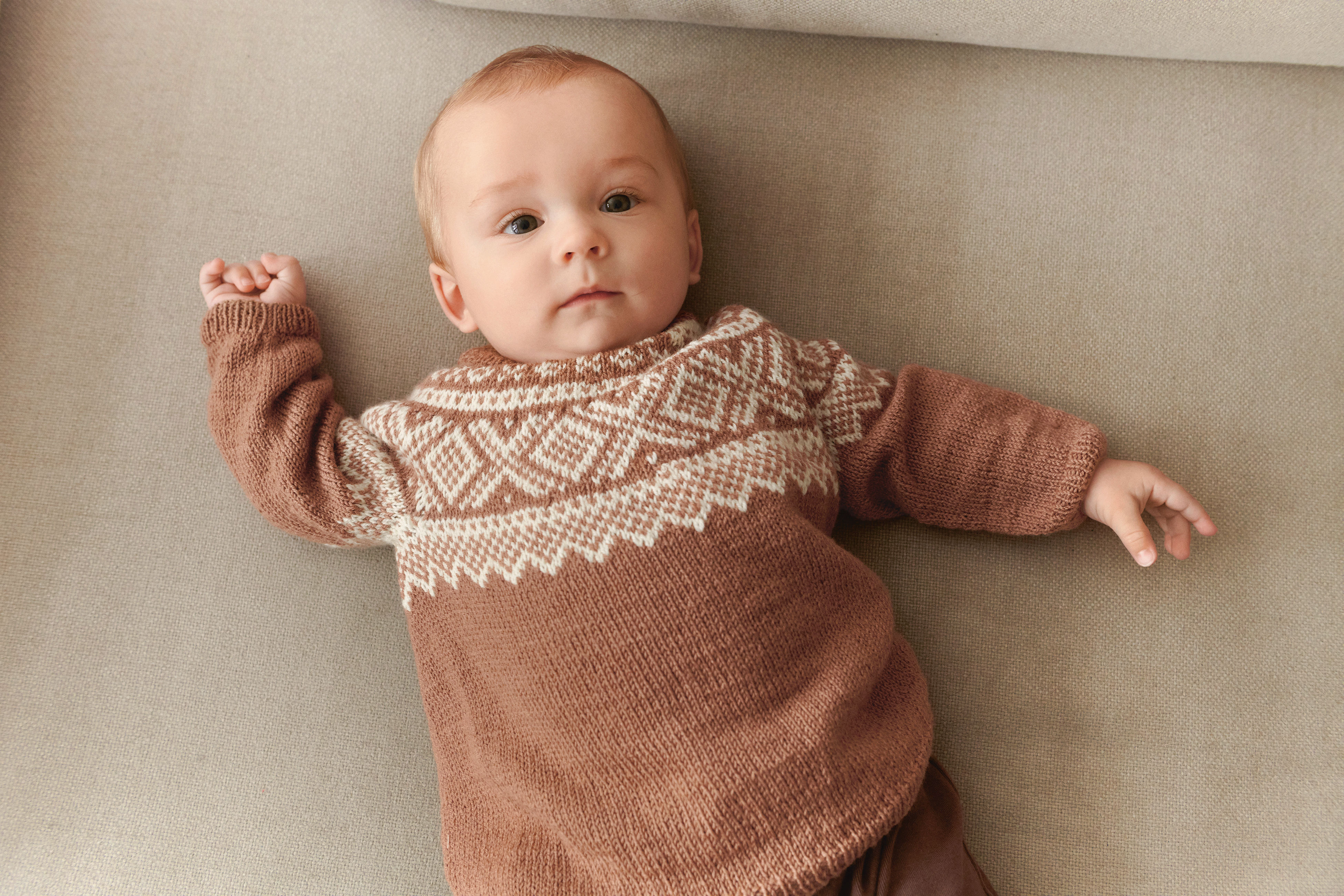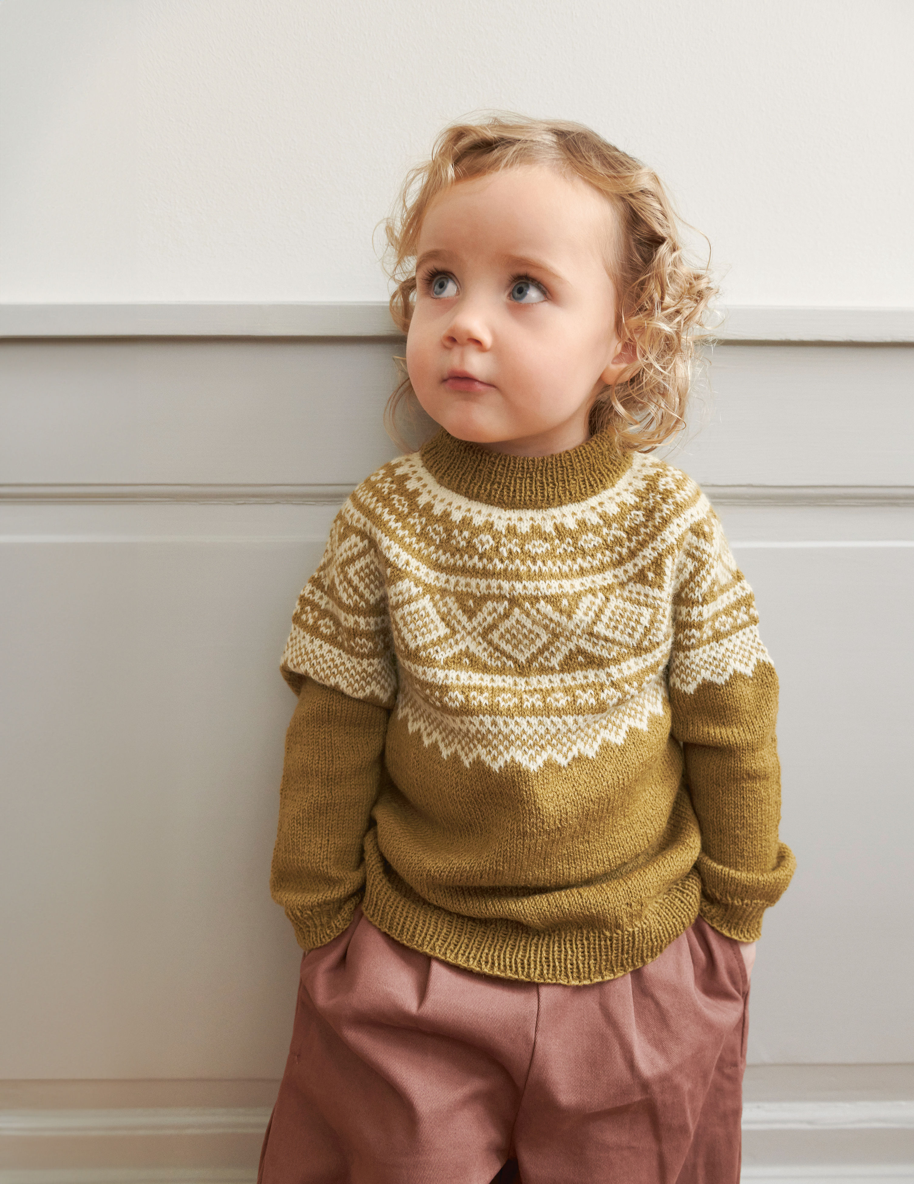 Deretter strikkes det vendepinner for å forme en dypere halsutringning foran. Videre strikkes det mønster etter diagram og det økes masker mellom mønsterbordene til et rundt bærestykke.