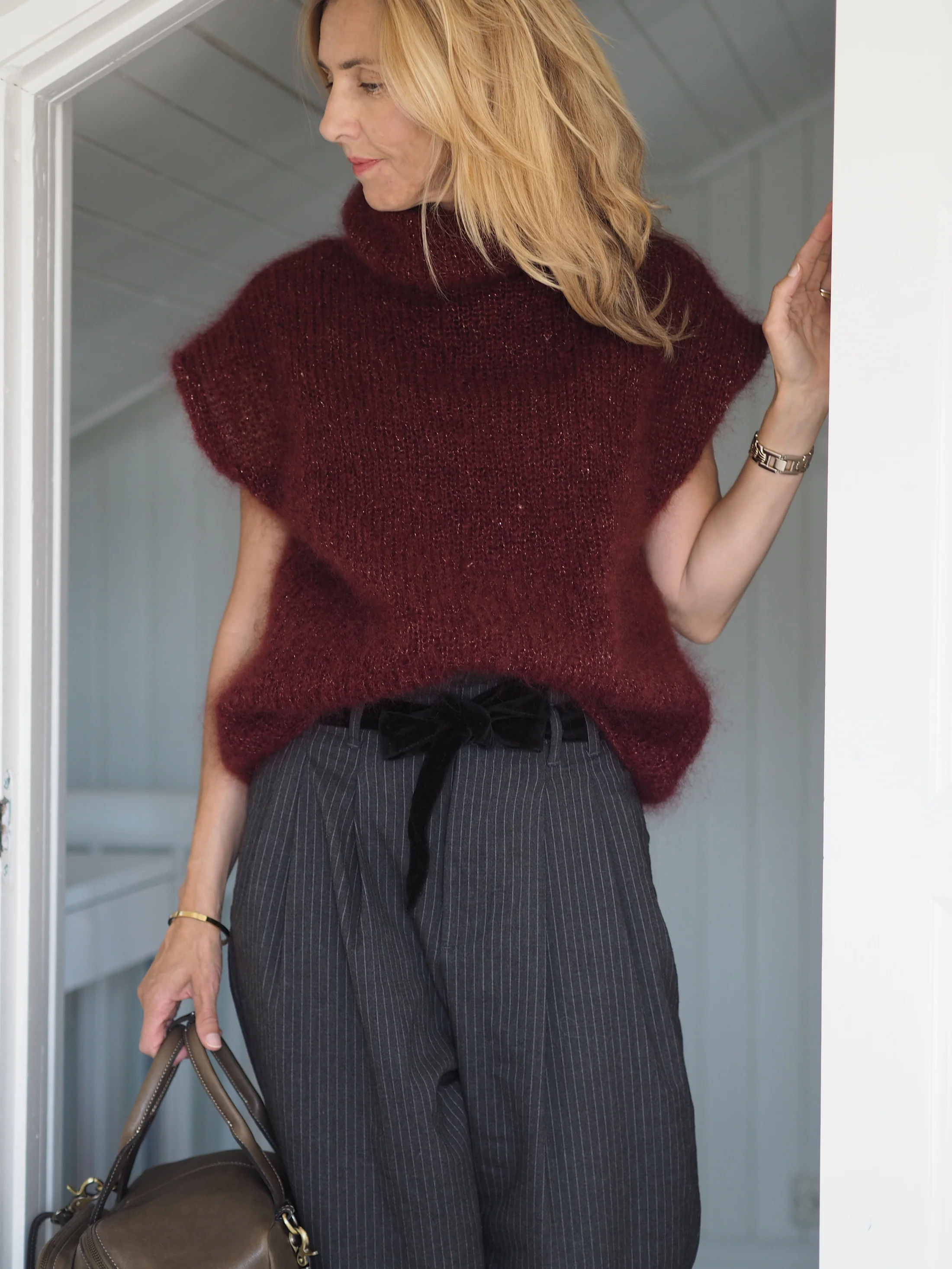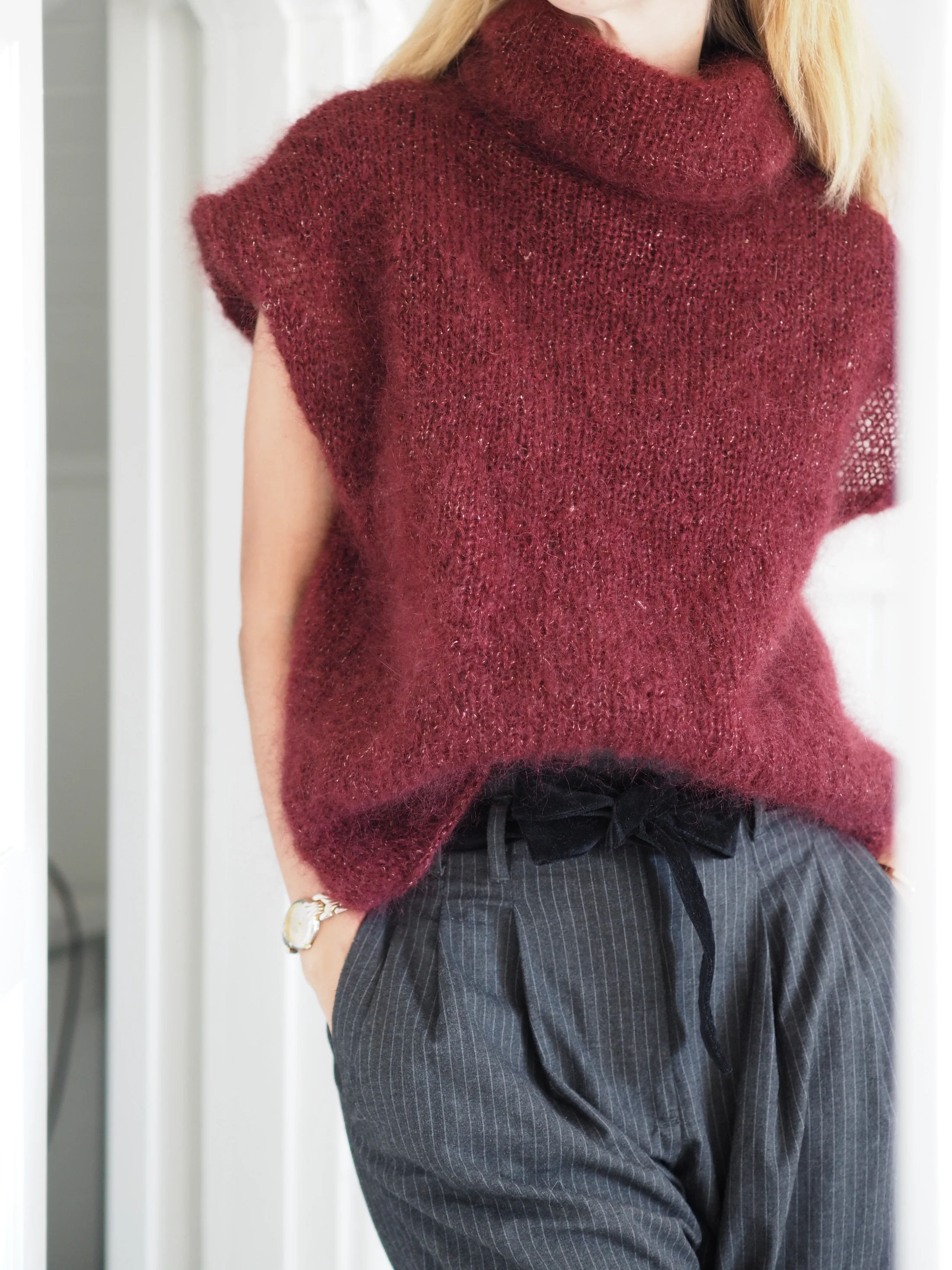 Hele arbeidet strikkes med enkel tråd. Bolen strikkes rundt på rundpinne, nedenfra og opp. Arbeidet deles ved ermehullene og strikkes ferdig hver for seg med skrå skuldre. Skuldrene sys sammen. Det plukkes opp masker til hals.