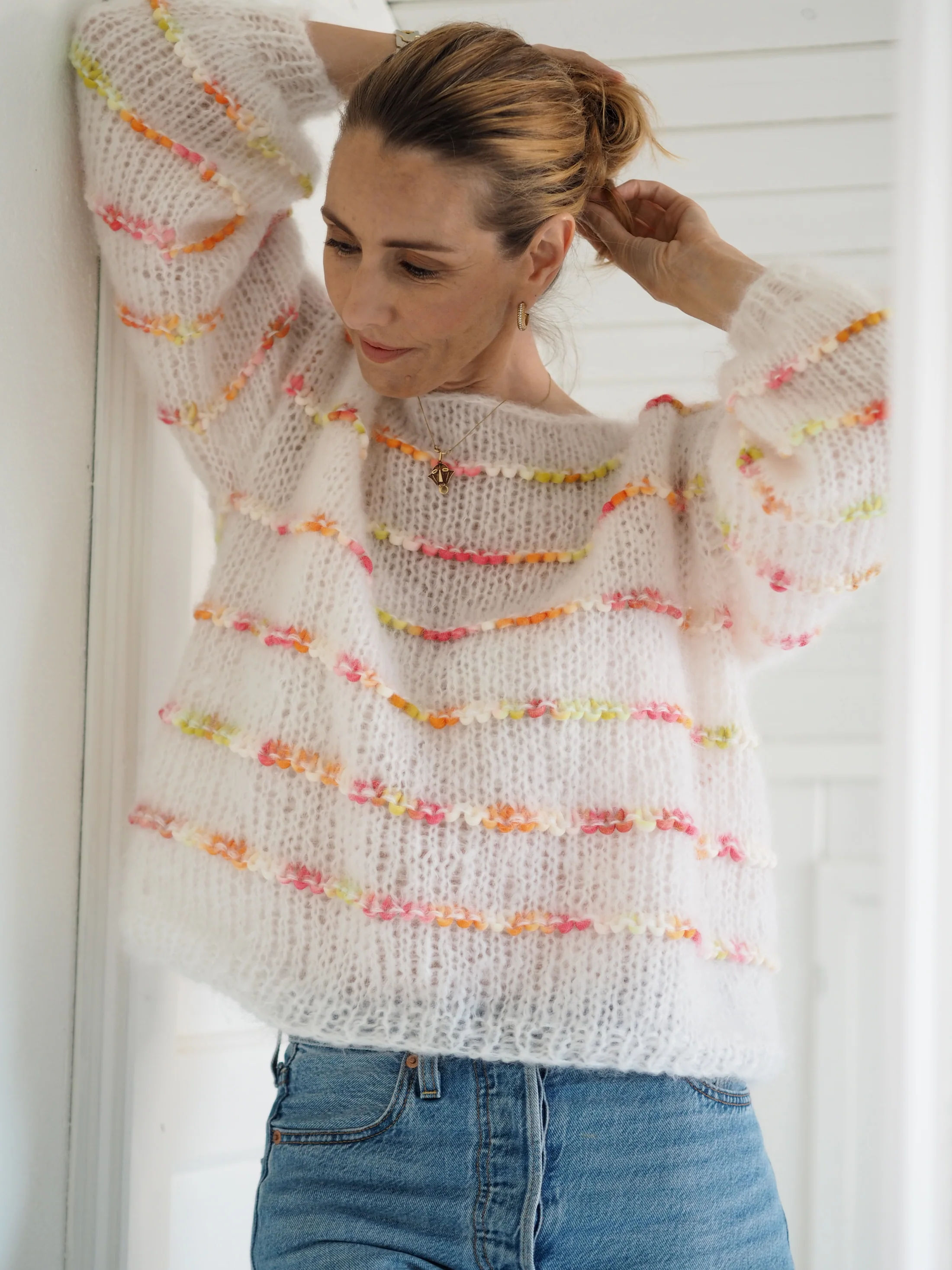 Ballerina Chunky Mohair, Sandnes Garn, 77% mohair, 18% ull og 5% polyamid, 50 g = 135 m, det strikkes med dobbel tråd. Gelato fra Lana Grossa, 52% bomull, 48% resirkulert polyamide, 100 g = 80 m