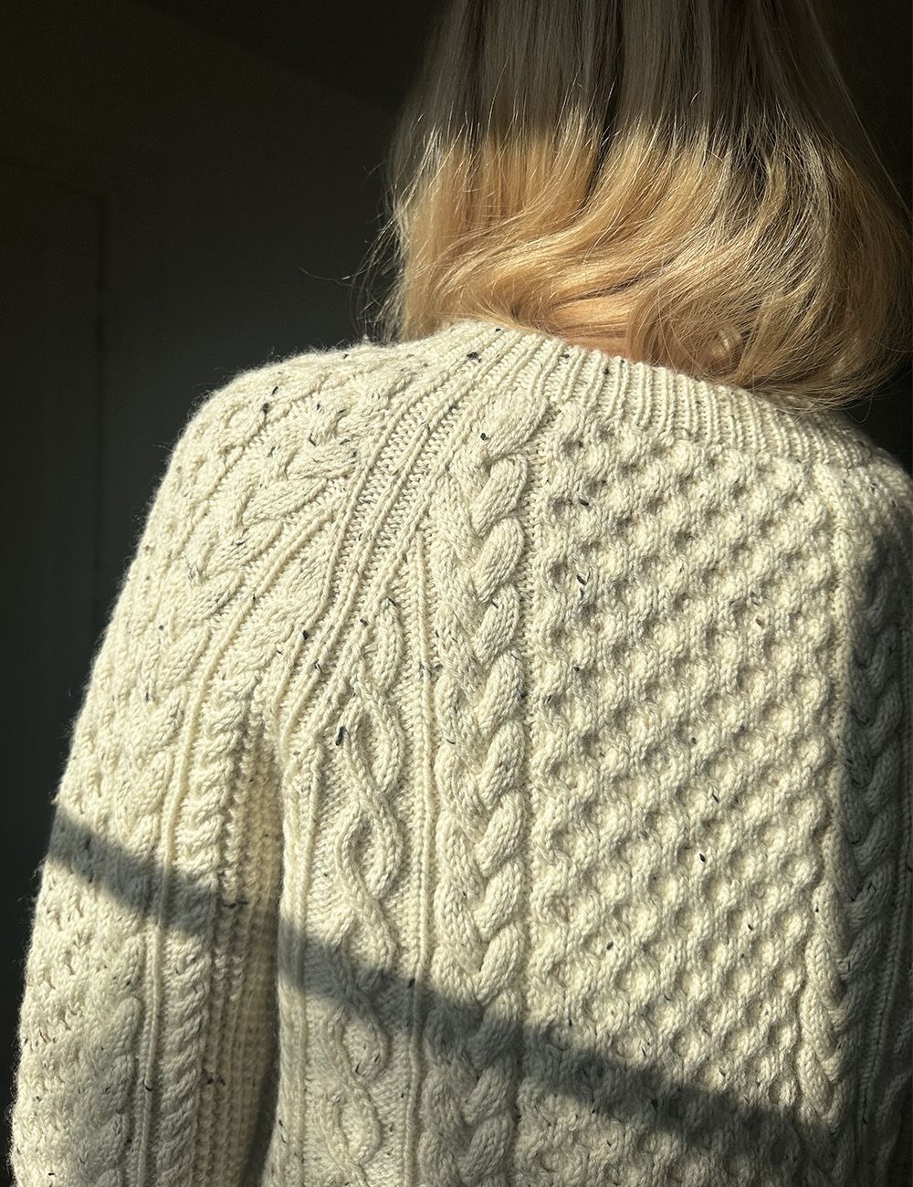 Ønsker du en lettere genser, kan du strikke i Tynn Peer Gynt og en følgetråd, f.eks. av mohair. Genseren kan også strikkes i Hjelholt Dansk Pelsuld 5,5/2 (100 g = 275 m).