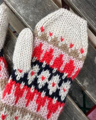 De røde Celeste Votter er strikket i Peer Gynt fra Sandnes Garn i fargene Camel [2542], Almond [2511], Night sky [5591], Ballet shoes [3521] og Poppy [4008].