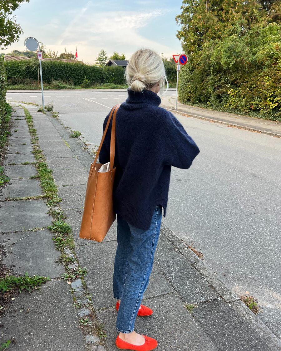Den mørkeblå Chestnut Sweater er strikket i Pelsuld 8/2 fra Hjelholts Uldspinderi i fargen Marine [21] sammen med Silk Mohair fra Isager i farge 100.