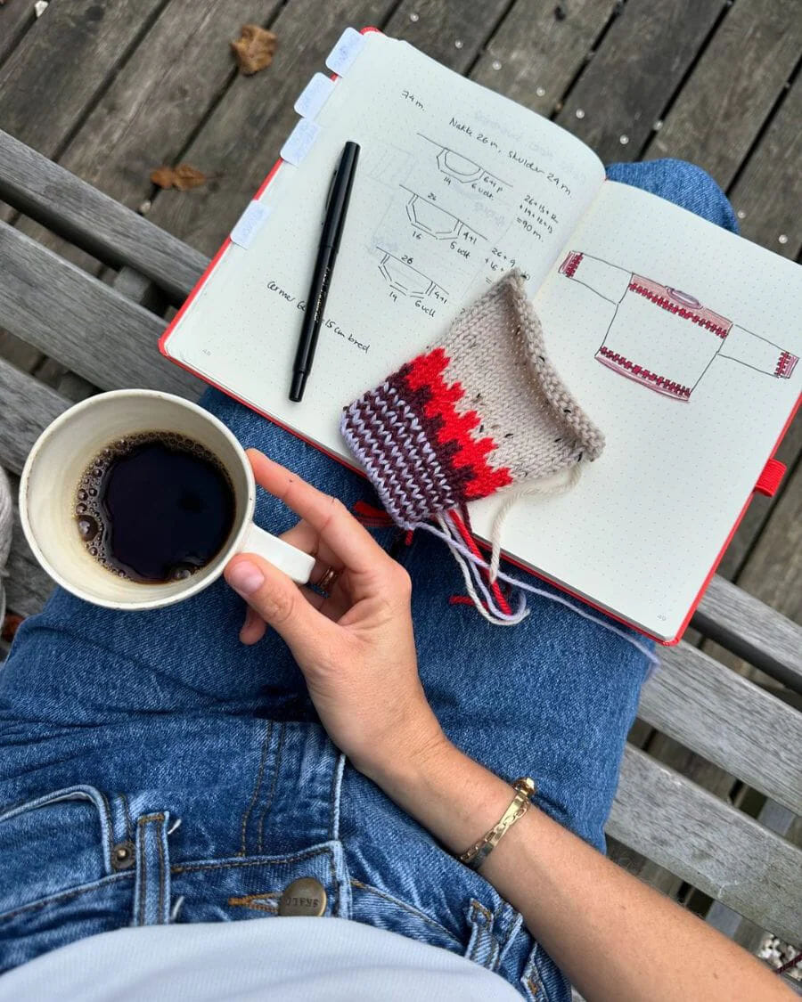 Cross Sweater bør ha en bevegelsesvidde (positive ease) på ca. 25 cm i de minste størrelsene, men gradvis mindre i de større størrelsene. Størrelsene XXS (XS) S (M) L (XL) 2XL (3XL) 4XL (5XL) svarer til et bystemål på 75-80 (80-85) 85-90 (90-95) 95-100 (100-110) 110-120 (120-130) 130-140 (140-150) cm. Målene på den ferdige genseren er angitt på forsiden av oppskriften. Vær oppmerksom på at disse målene kun gjelder dersom strikkefastheten overholdes. Mål deg selv før du går i gang med å strikke, for å vurdere hvilken størrelse som vil passe deg best. Dersom du f.eks. måler 95 cm rundt om bysten (eller det bredeste sted på overkroppen), bør du strikke str. M. En genser i str. M har overvidden 120 cm og vil i nevnte eksempel gi en bevegelsesvidde (positive ease) på 25 cm.