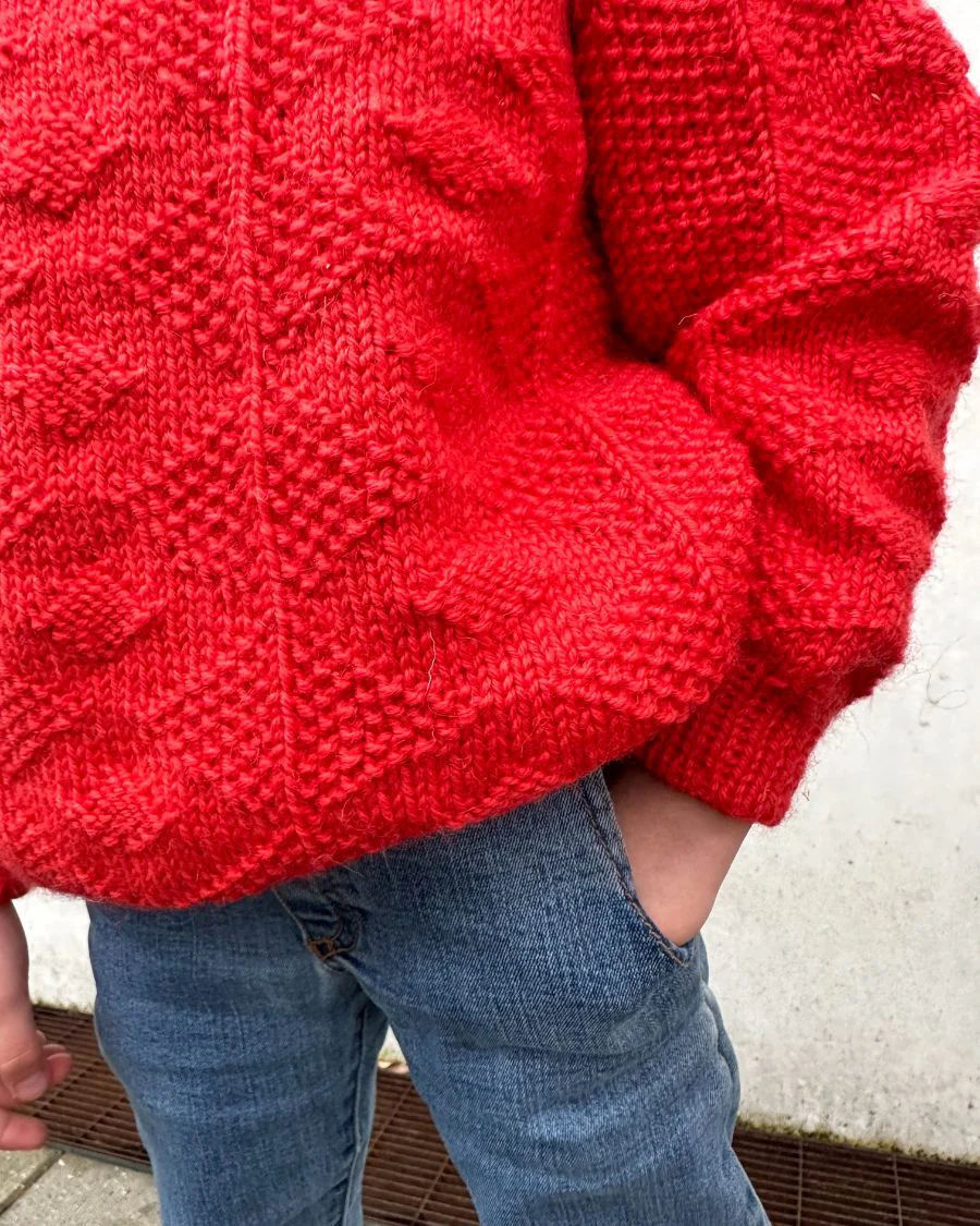 Den røde Esther Sweater Junior er strikket i Peer Gynt fra Sandnes Garn i fargen Poppy [4008].