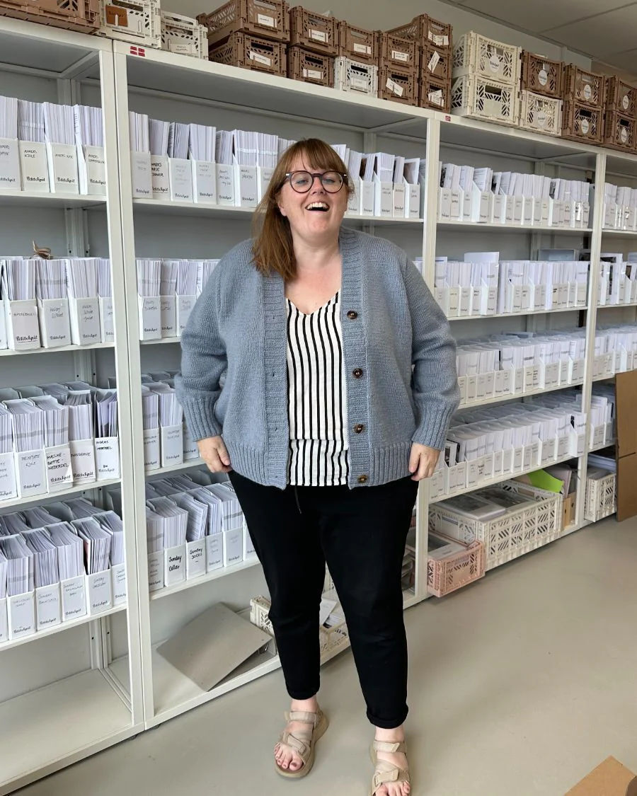 Den lyseblå Eva Cardigan er strikket i Peer Gynt fra Sandnes Garn i fargen Above the clouds [6050].