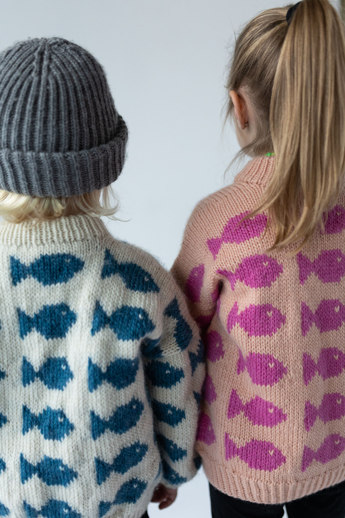 Strikkeoppskrift genser til barn. Søt genser strikket i Hip Wool. Genseren strikkes nedenfra og opp. Når ermeåpning lages så deles for- og bakstykket i 2 deler som strikkes videre hver for seg til oppgitt lengde. Sys eller strikkes sammen over skuldre. Ermer strikkes ovenfra og ned – det strikkes opp masker i ermeåpning på bol. Avbildet er fargene «Coconut White» med fisker i «Blue waves» Hip Wool. Lys fersken og rosa genser er «Just Peachy» og «Flamingo fever» Hip Wool i størrelse 6 år på barn snart 5 år (sammen med POP lue).