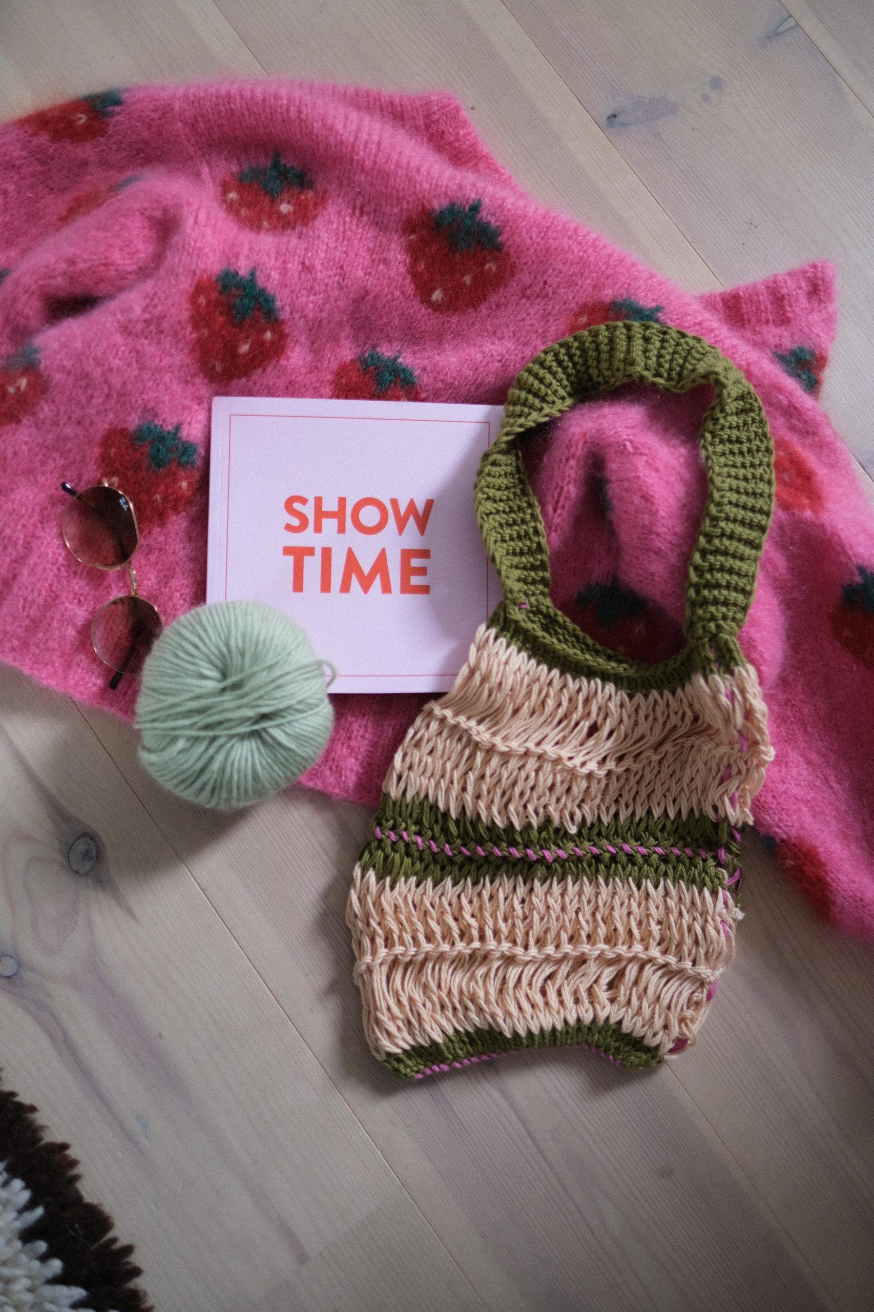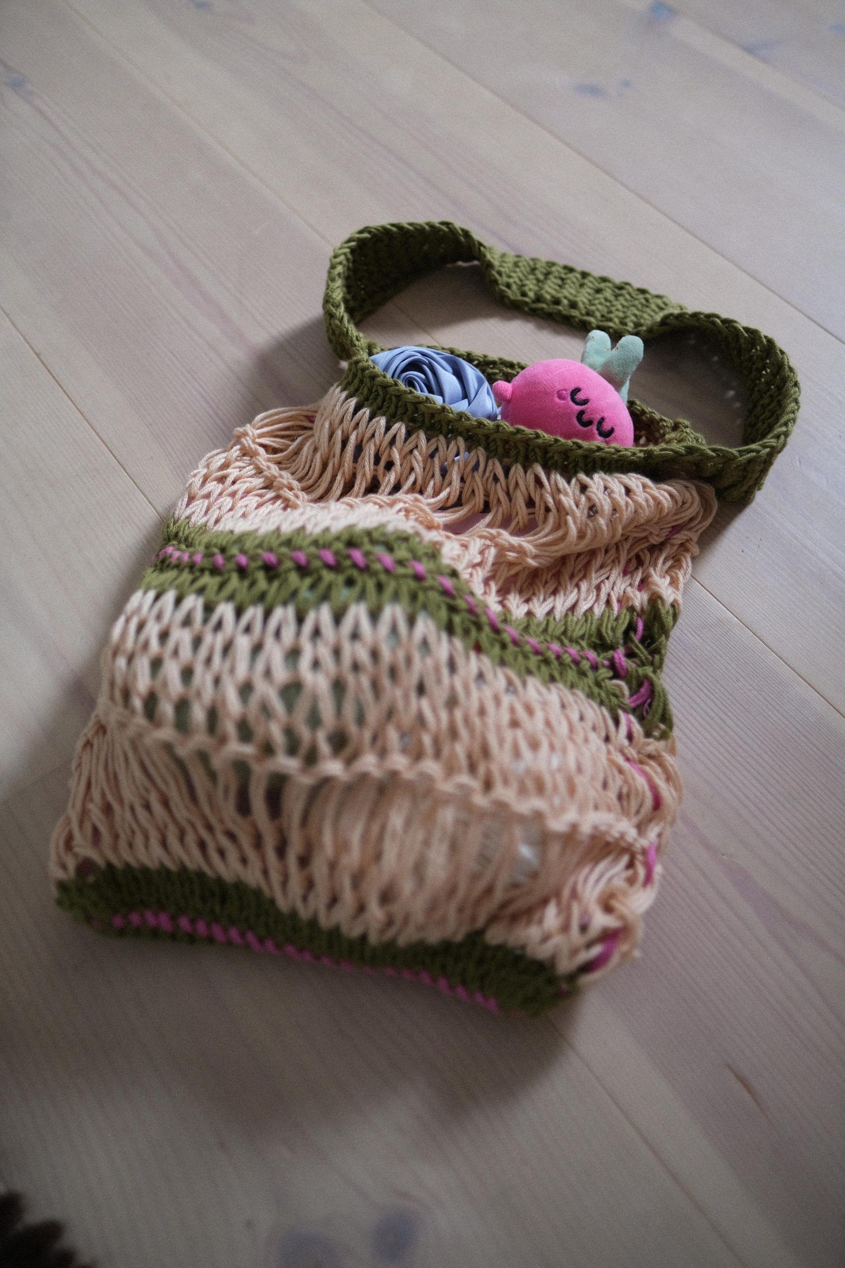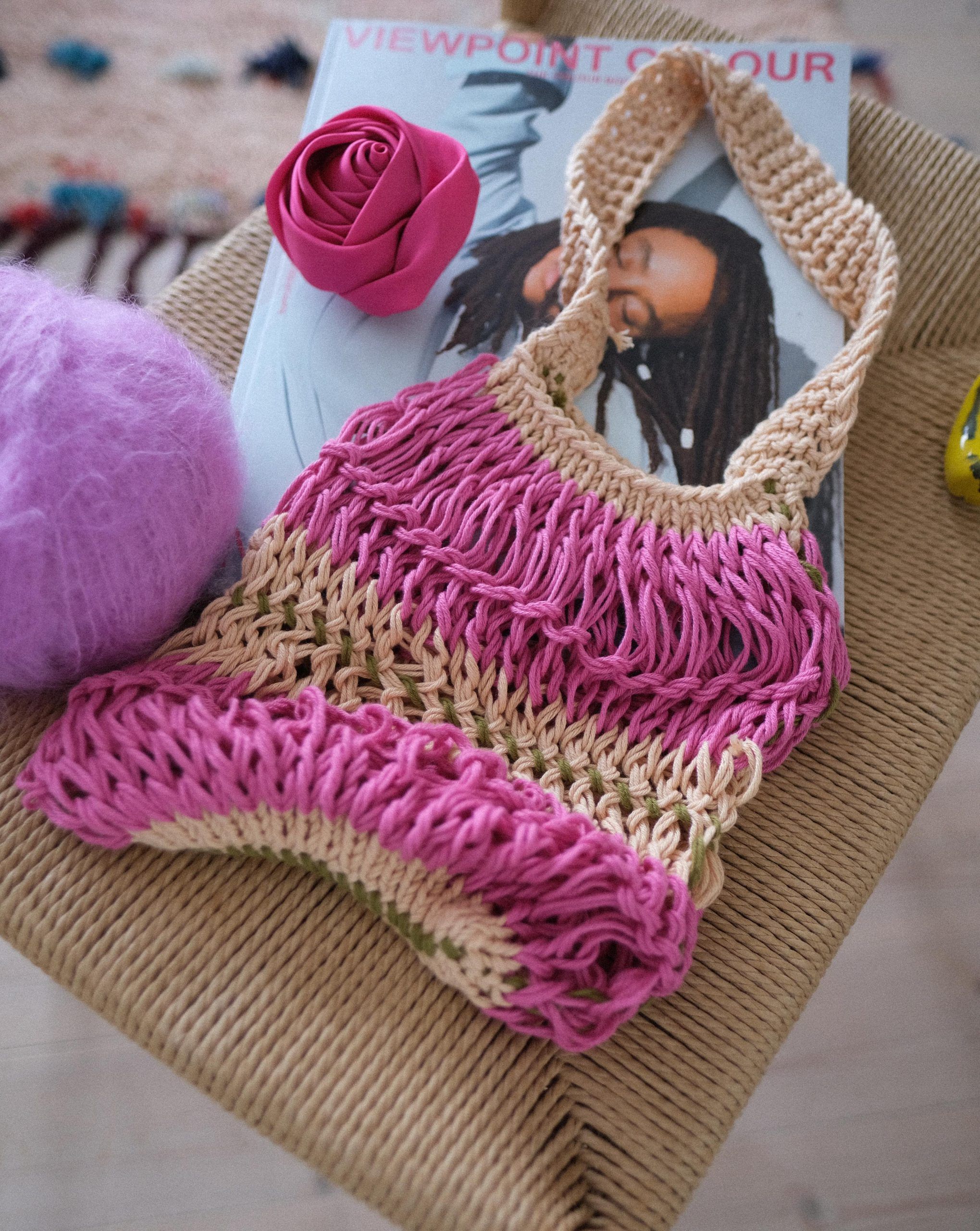 Vesken er perfekt til en dag på stranda og fantastisk til utforskning av byen med boho stil! På bildene er vesken i størrelse M, strikket i Cuddle Me Cotton i fargene “Beach Bum” (hovedfarge), «Into the Wild» og “Hubba Bubba Pink”. Design av Lynxrows for HipKnitShop.