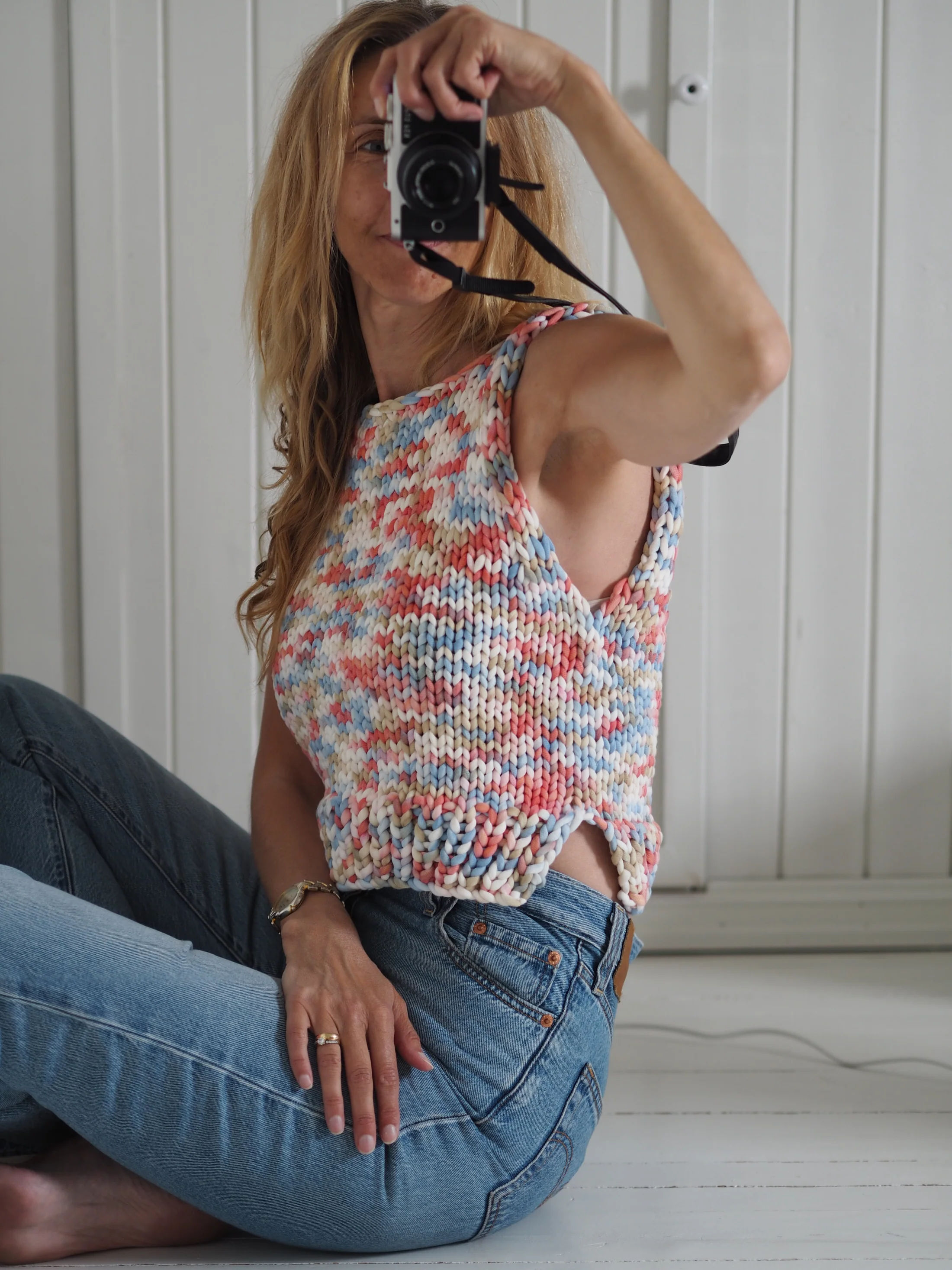En enkel kort chunky top som også kan brukes som vest. Garnet er elastisk og vil gjøre plagget strechy. Målene tas flatt. Toppen kan fint forlenges, men da må også garnmengden justeres.