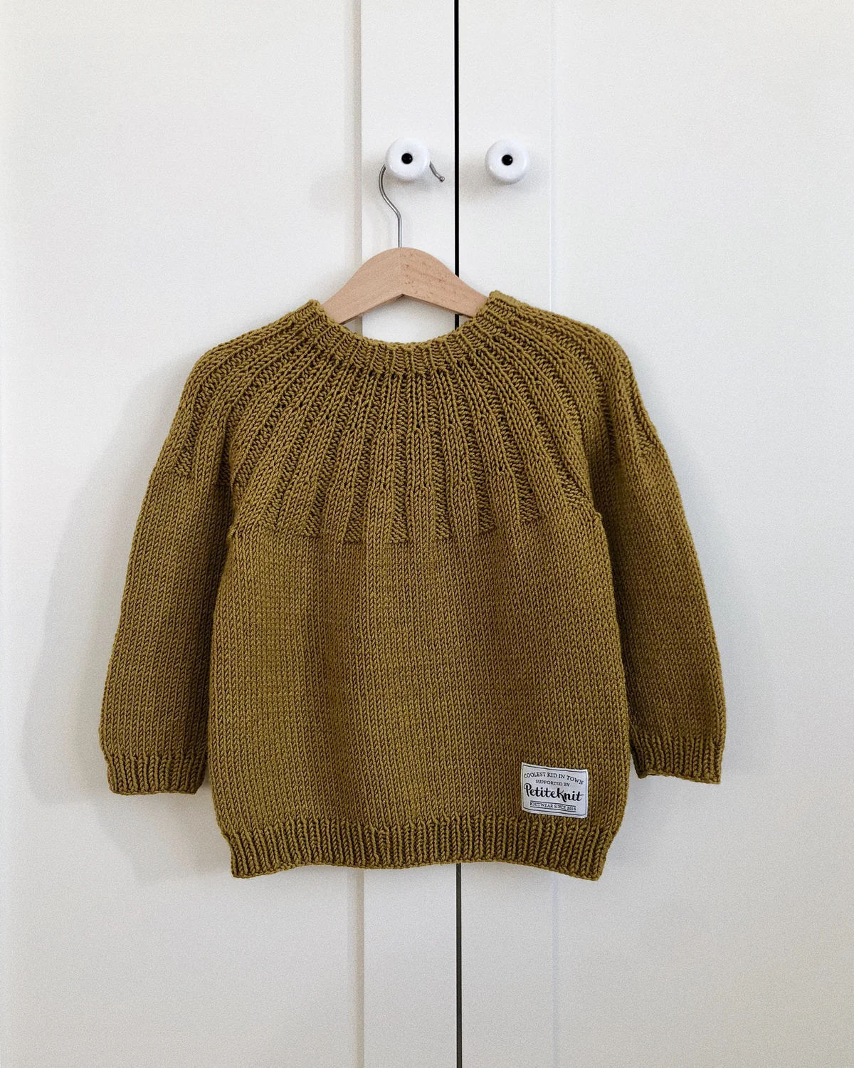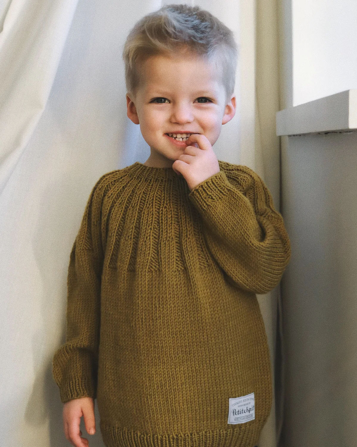 Den grønne Haralds Sweater er strikket i Merinoull fra Sandnes Garn i fargen Okker [2035]