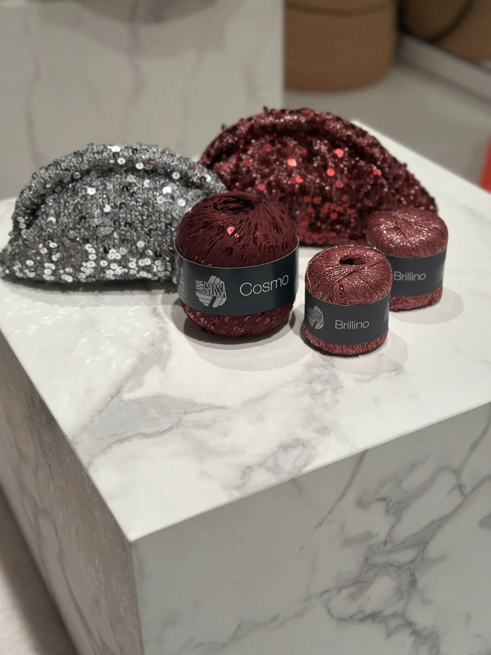 Cosmo fra Lana Grossa; 100 % bomull (paljetter),100 g /260 m. Brillino fra Lana Grossa; 83 % viskose, 17 % metallisk fiber 25 g /200 m.
