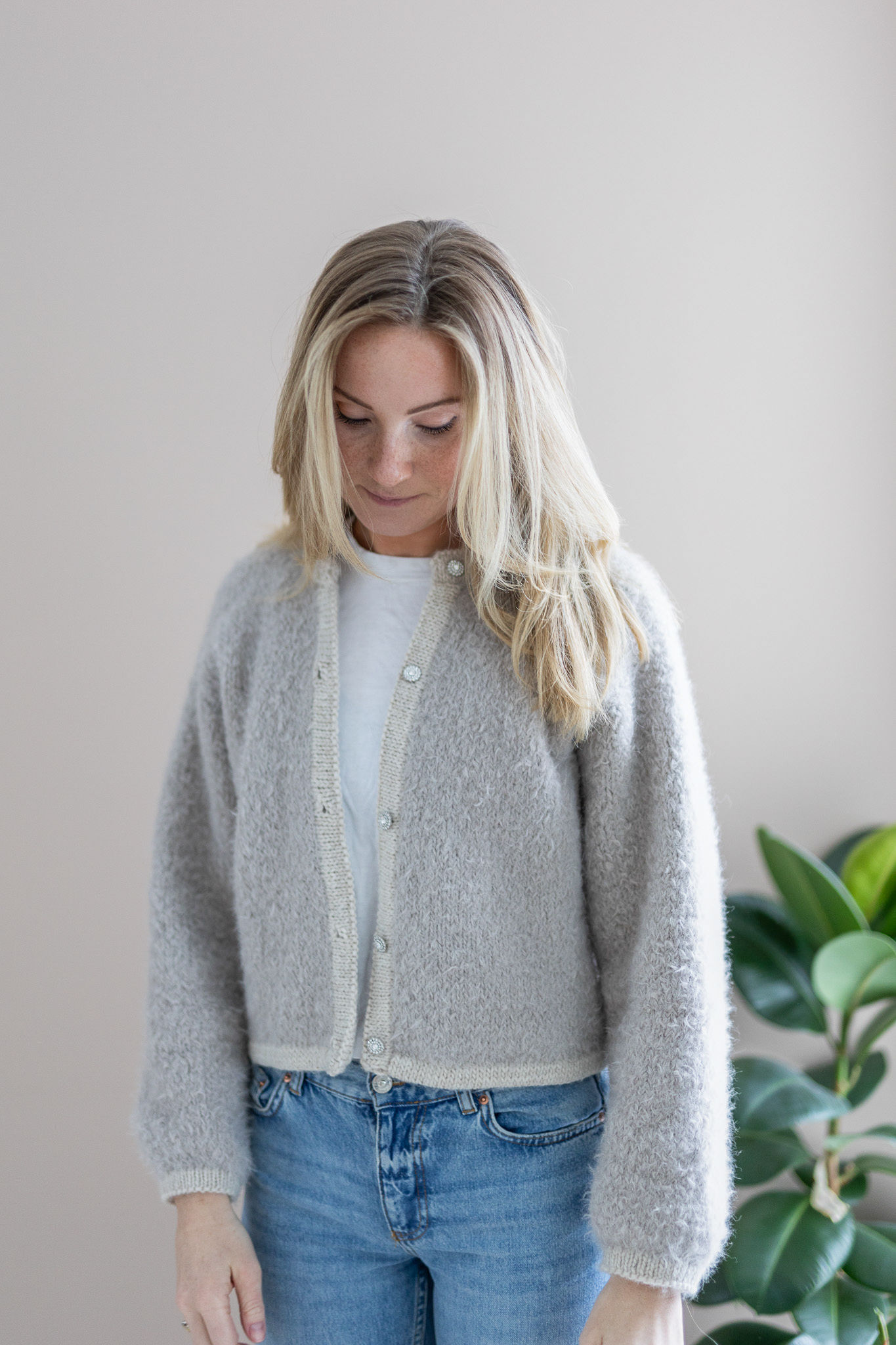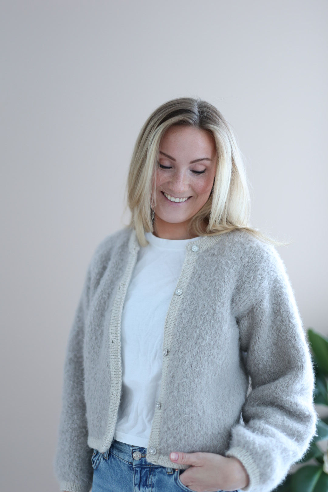 Jakken strikkes i Wild Wool og kantene i Hip Wool. Avbildet er jakken strikket i fargen Wild & Beige (Wild Wool) og Cream (Hip Wool) i str XS (modell er 170 cm høy og str XS).