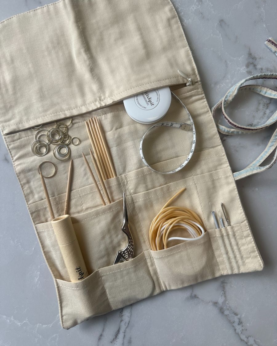 Knitter's Needle Case - To Go er etuiet kan ta med deg på tur uten å mangle pinner eller noe annet du trenger for å fullføre et strikkeprosjekt. I etuiet er det plass til både rundpinner, strømpepinner, ekstra pinnespisser og ekstra wires. Det er også lommer for det mest nødvendige utstyret som saks, maskewires og maskemarkører. Etuiet holdes lukket med en snor.