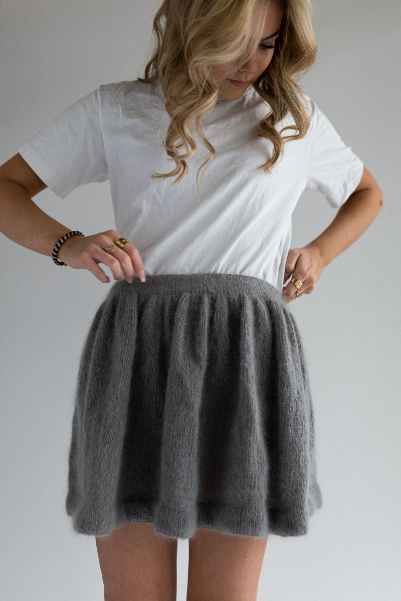 Strikkeoppskrift til nydelig tyllskjørt i mohair. Skjørtet strikkes ovenfra og ned i dobbel tråd Hip Mohair med brettekant til strikk. Elastisk strikk i midje. Det er strikket vendepinner på baksiden for økt lengde.