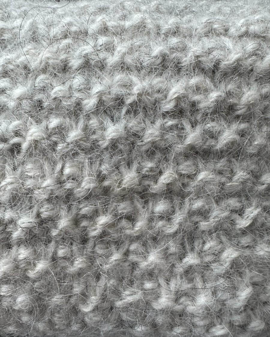 Materialer: Forslag 1: Ca. 27 (32) 60 g Pelsuld 5,5/2 fra Hjelholts Uldspinderi (100 g = 275 m) strikkes sammen med ca. 9 (10) 20 g Soft Silk Mohair fra Knitting for Olive (25 g = 225 m) eller Silk Mohair fra Isager Yarn (25 g = 212 m)