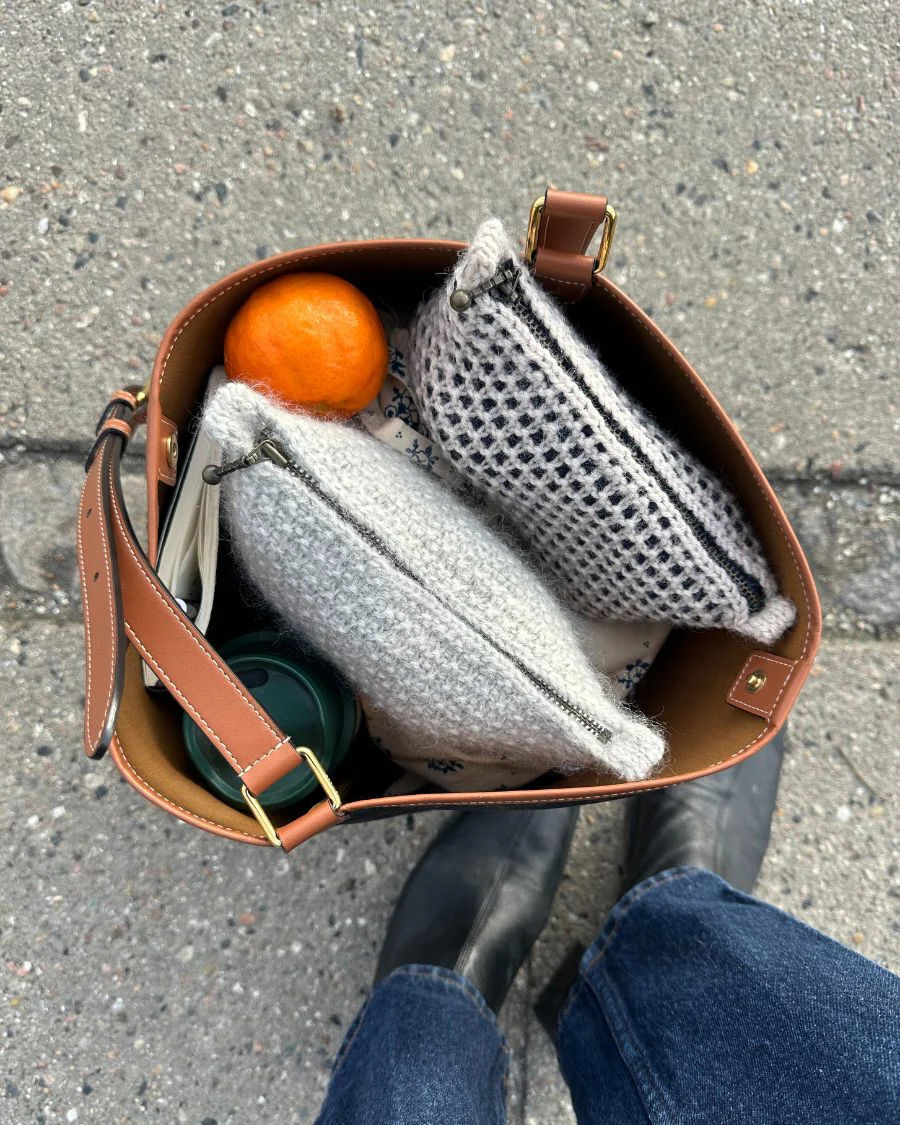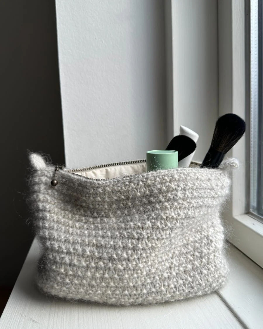 Den blå og hvite Marie Case er strikket i størrelsen mellom i i Peer Gynt fra Sandnes Garn i fargene Almond [2511] og Night sky [5591].