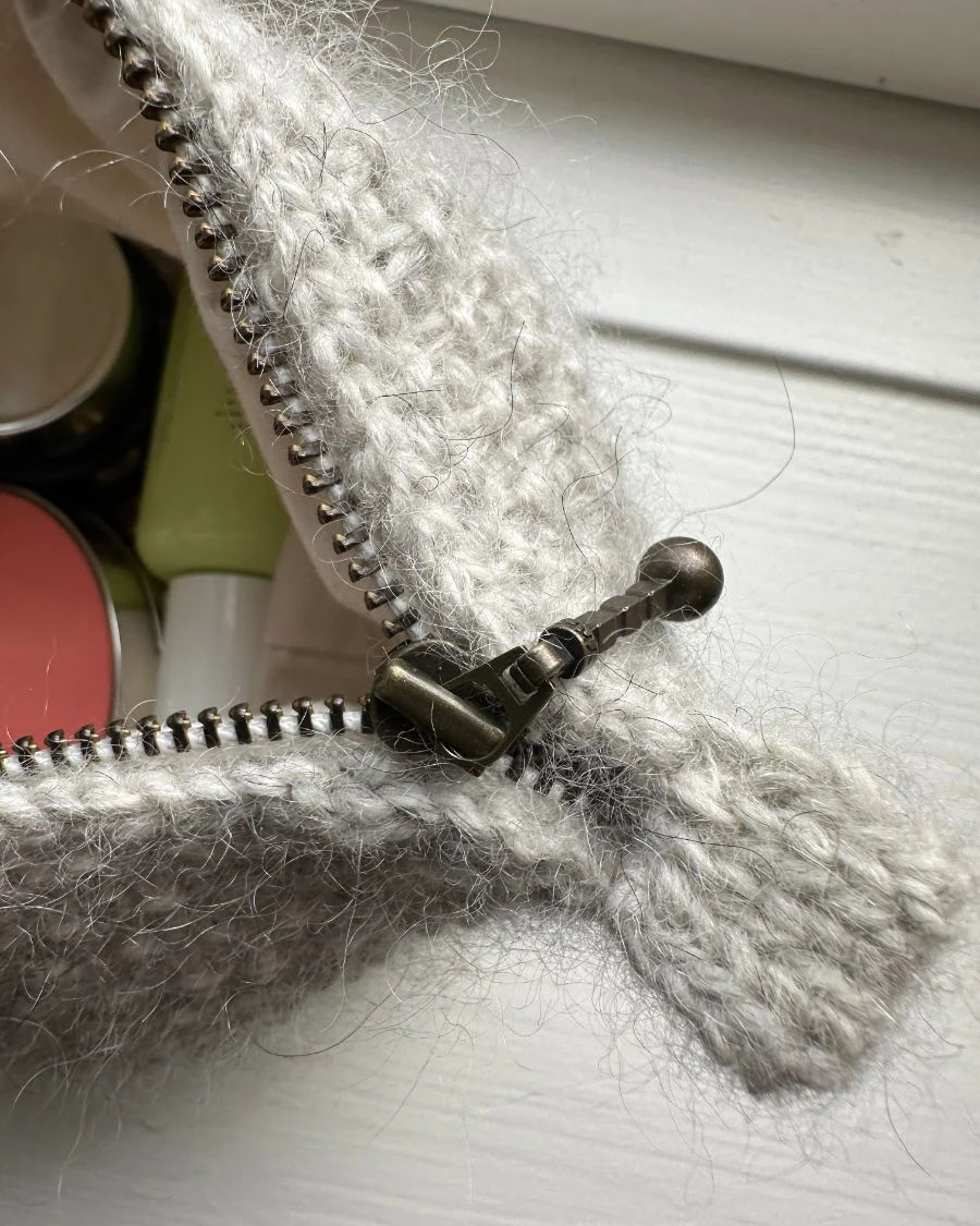 Glidelås 4 mm, 14 (17) 23 cm. Stoff til fôr, 17,5 x 23,5 cm (20 x 24,5 cm) 26 x 38 cm