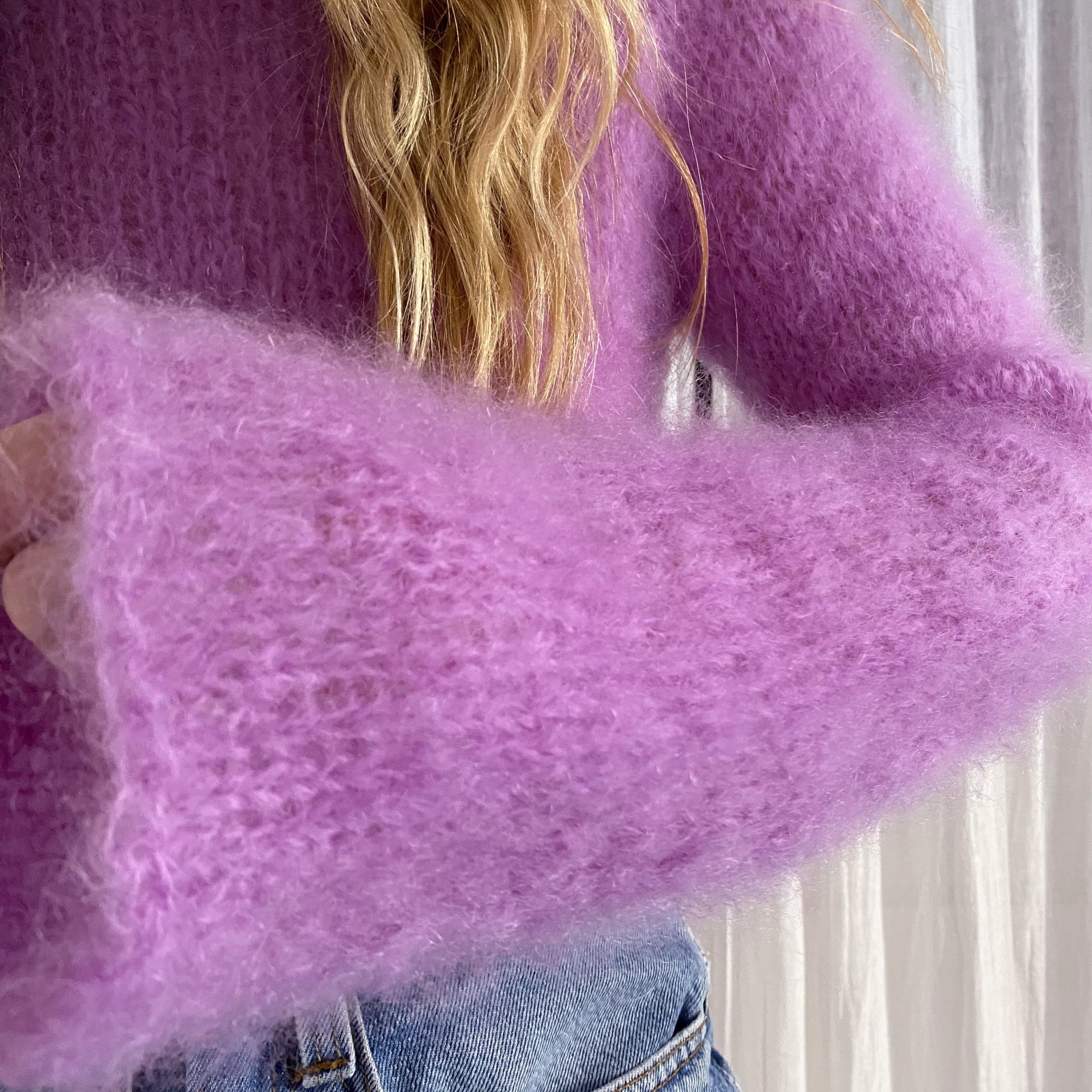 Passform er smal – velg en størrelse som er 4 cm mindre enn din overvidde om du ønsker samme passform. Genseren er kort i bol, strikk gjerne lengre dersom du ønsker dette (obs. da må det beregnes mer garn enn oppgitt)