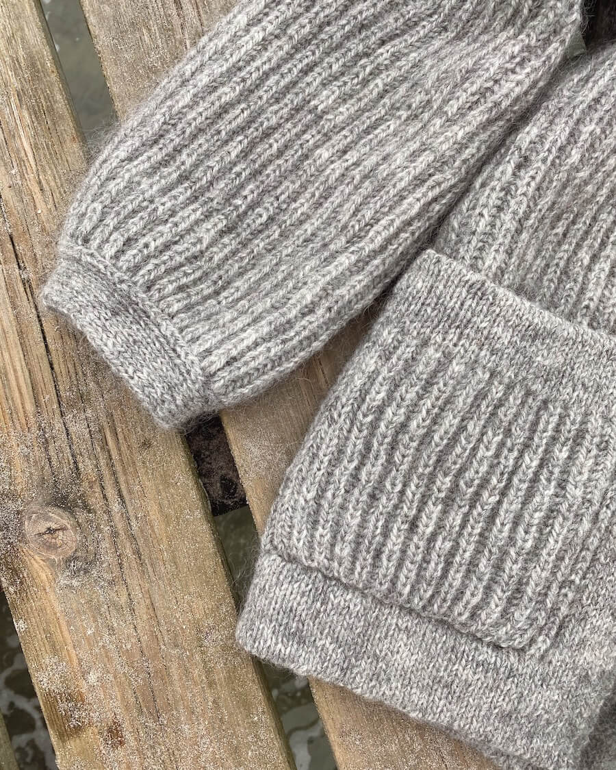 November Jakken på billedet er strikket i Håndværksgarn fra Hjelholt Uldspinderi i farve 02 (Lysegrå)