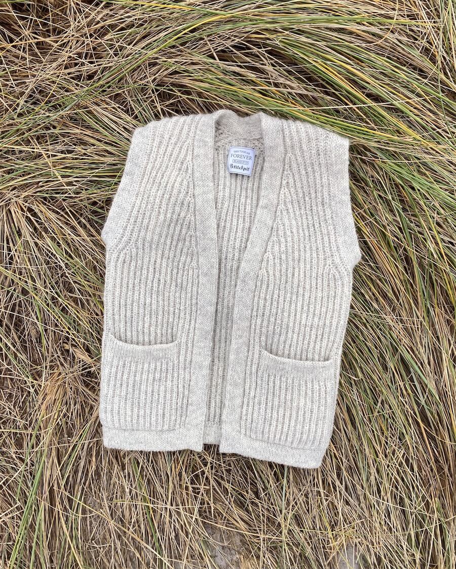 November Vesten på billedet er strikket i Håndværksgarn fra Hjelholt Uldspinderi i farve 23 (Sand).