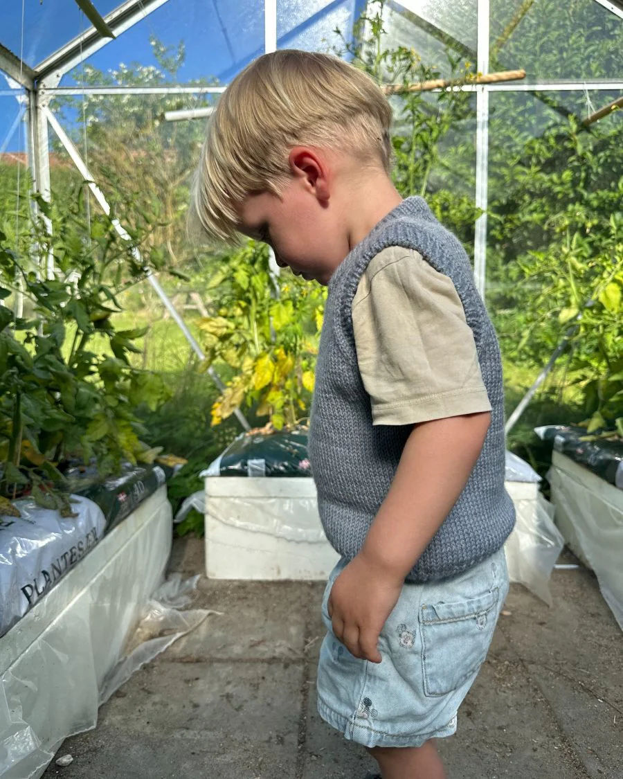 Den blå Novice Slipover Junior er strikket i Peer Gynt fra Sandnes Garn i fargen Above the clouds [6050].