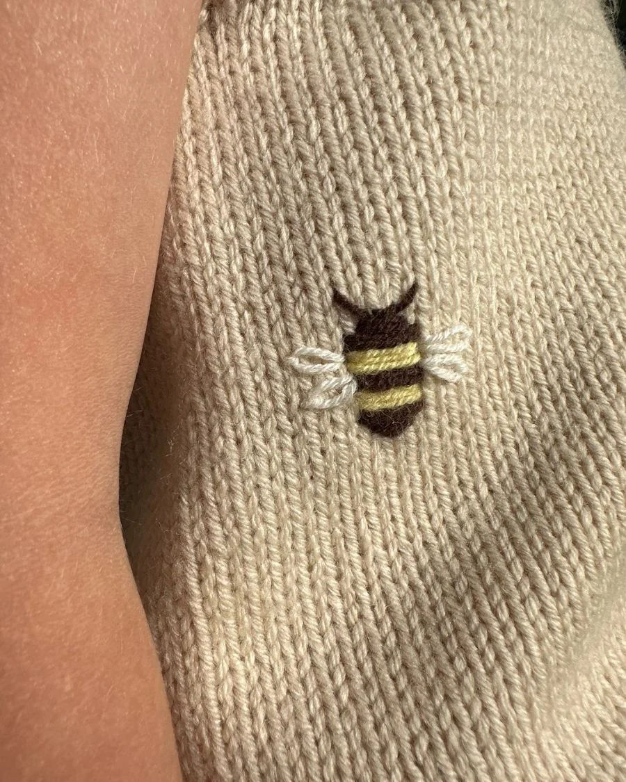Den hvite Novice Slipover Junior er strikket i Double Sunday fra Sandnes Garn i fargen Almond [2511]. Biene er brodert med Sunday fra Sandnes Garn i fargene Cacao nibs [3091], Pineapple [2013] og Whipped cream [1012]. Merk at oppskriften ikke inneholder broderianvisninger.