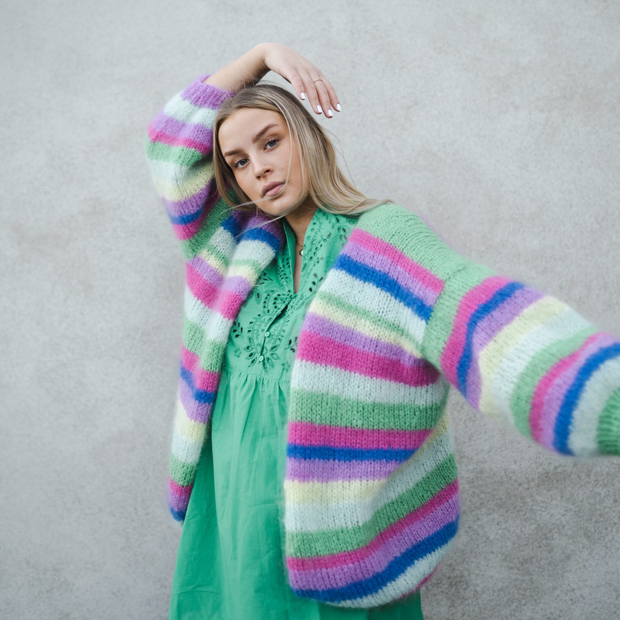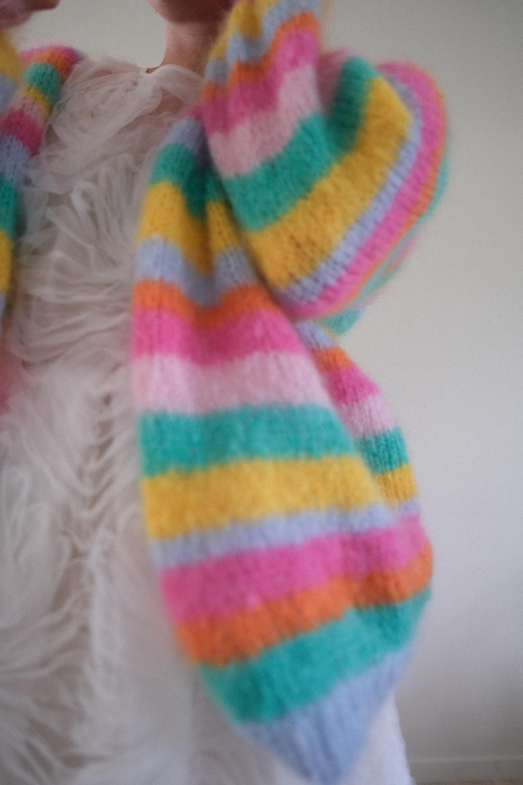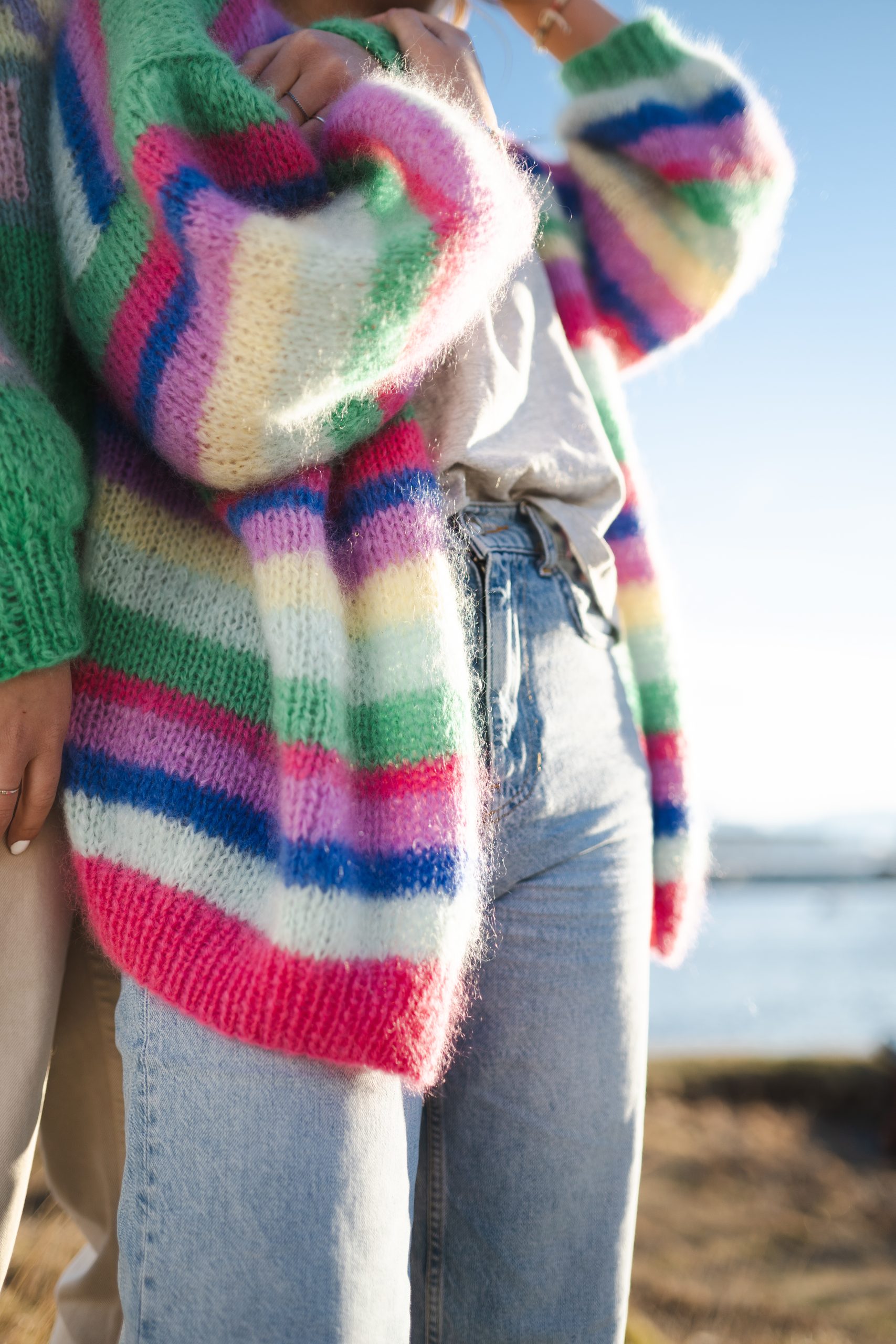 Fargerik versjon er str M/L, Farge 1: Bubblegum Hip Mohair (4 nøster, alternativt 2 nøster Fluff), 2: Must have mint Fluff (2), 3 Bubbly Blue Fluff (1 nøste), 4: Blooming Lilac Fluff (2 nøster), 5: Jelly bean green Fluff (2 nøster) 6: Lemonade Fluff (1 nøste). Ermeribb Blooming lilac og Jelly bean green.