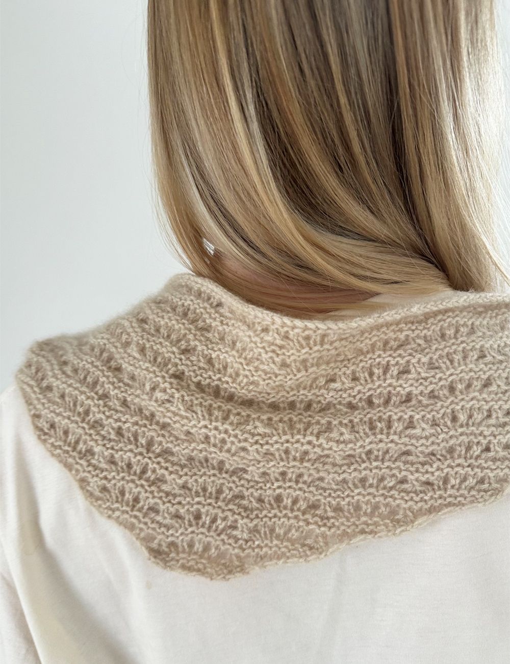 Man begynner i skjerfets spiss. Derpå strikker man frem og tilbake på rundpinnen med mønster etter diagrammet (eller teksten). Det økes automatisk i hver side, når man følger diagrammet (eller teksten). Dvs. det blir automatisk fler og fler masker.