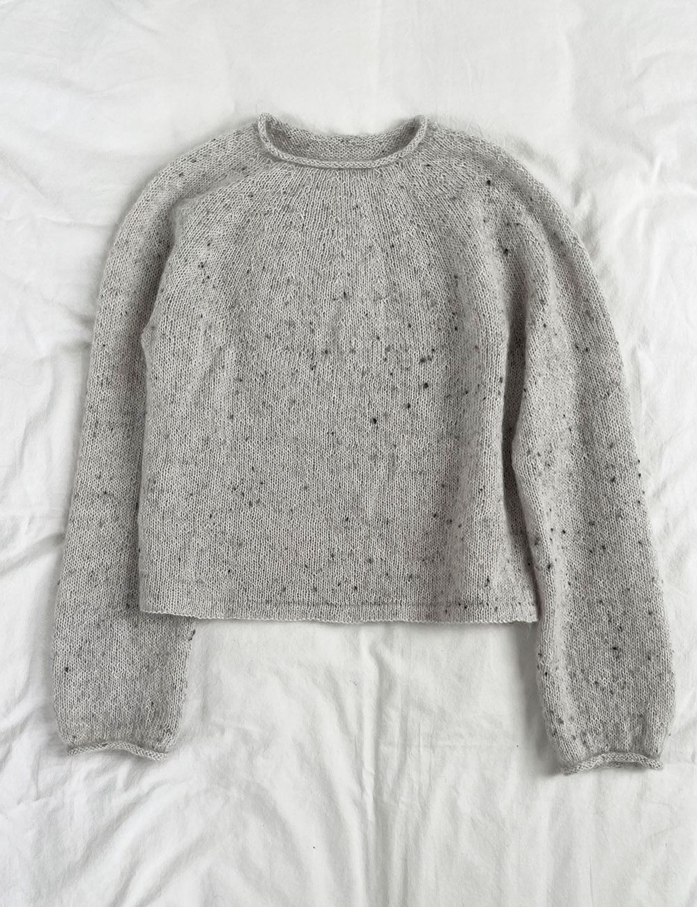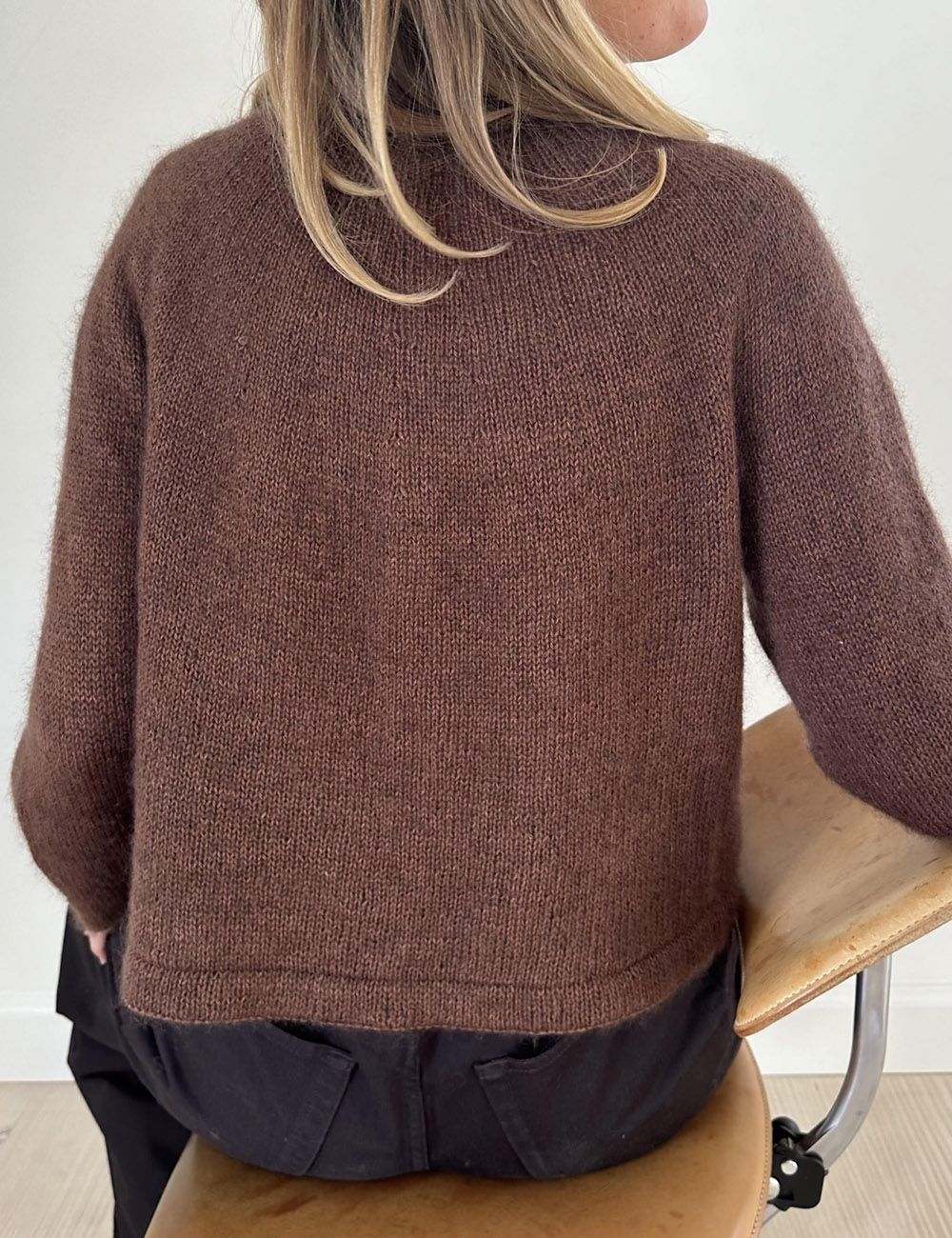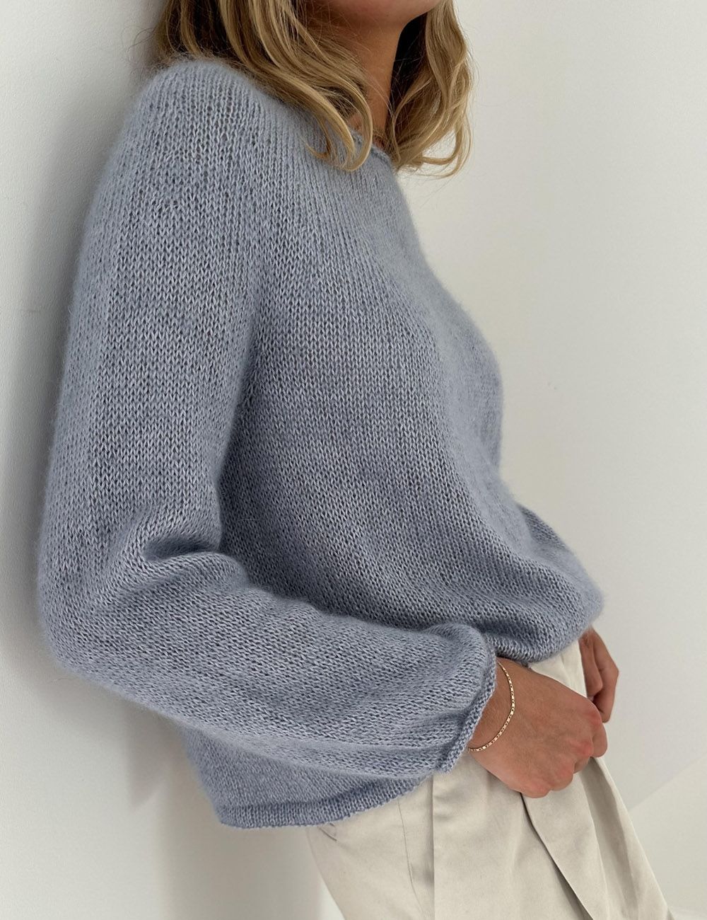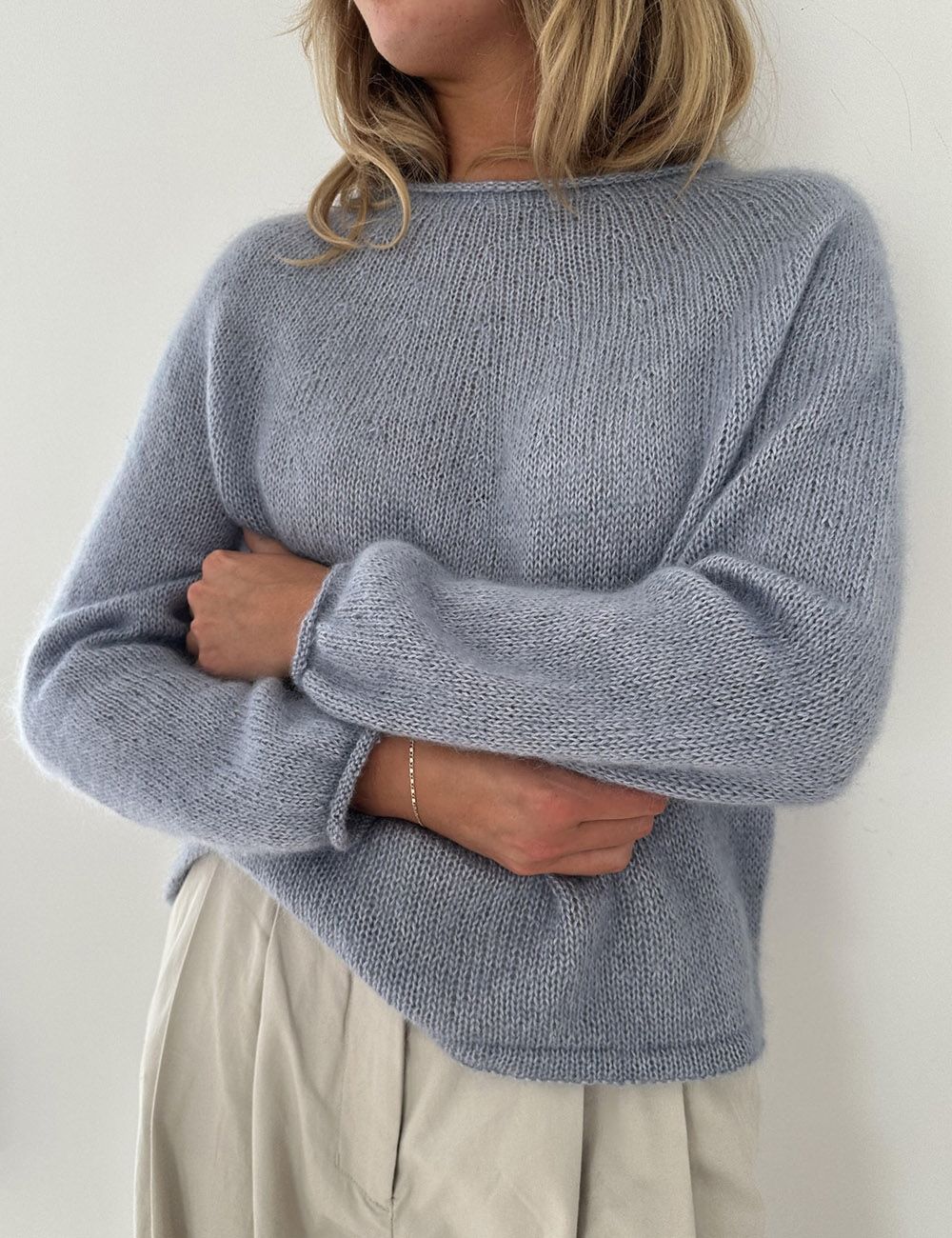 Plain Yoke Blouse er strikket ovenfra og ned. Alt strikkes rundt i glattstrikk, dermed strikker du bare rettmasker. Det runde bærestykket formes med økninger. Den eneste forskjellen mellom ”Detailed edition” og ”Debutant edition” er at halsen i «Debutant edition» er lik foran og bak.