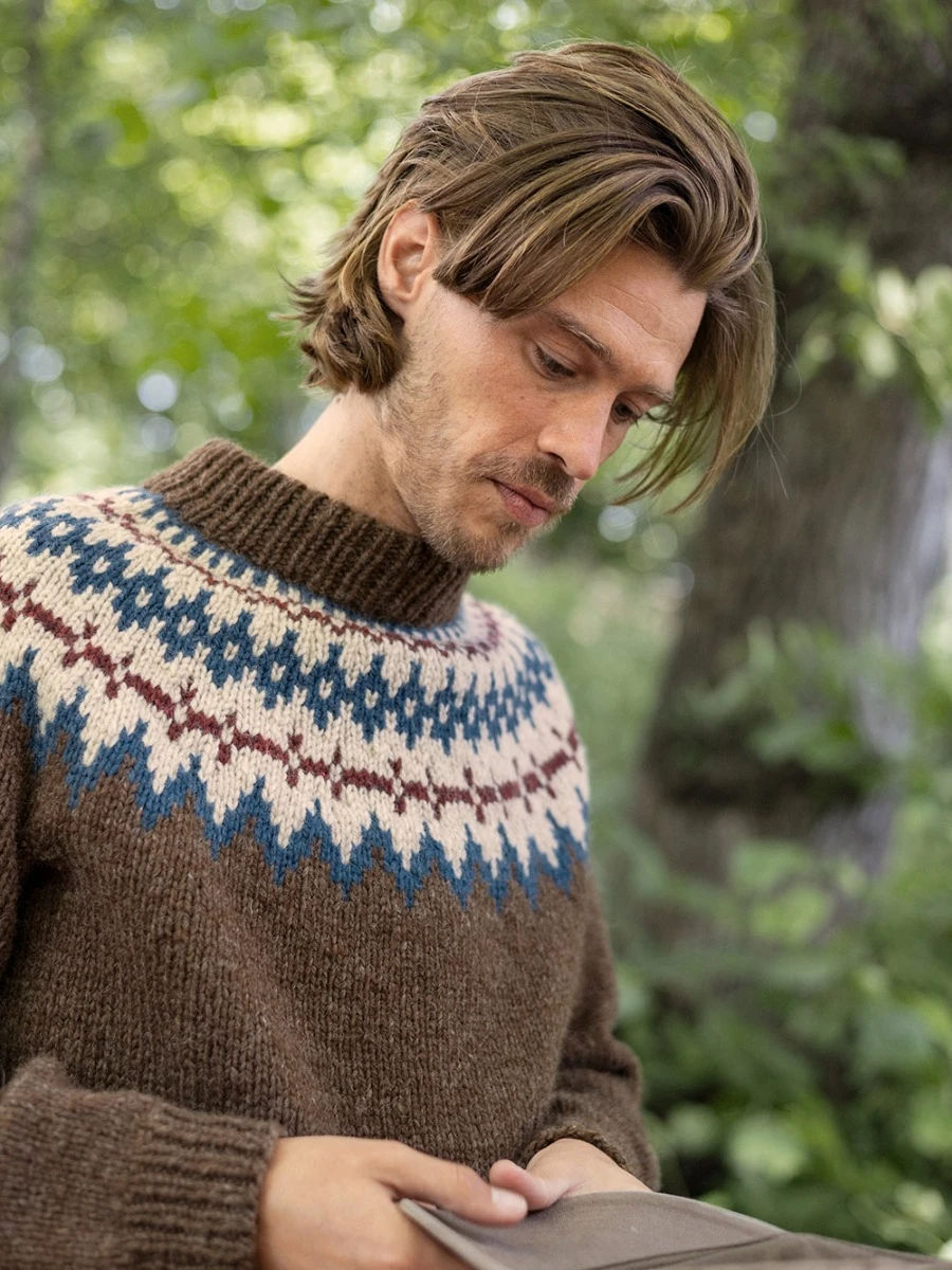 Vrangborden strikkes først, deretter strikkes det glattstrikk med bunnfargen til under ermene. Fra under ermene strikkes delene sammen. Det strikkes rundt med mønster etter diagram og felles til rundt bærestykke. Videre strikkes det vendepinner for å forme en dypere halsutringning foran. Halskanten strikkes til slutt.