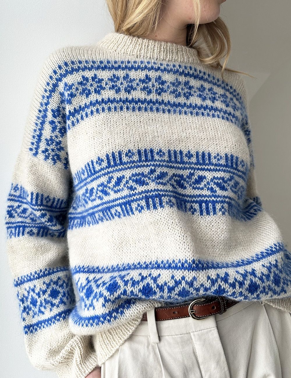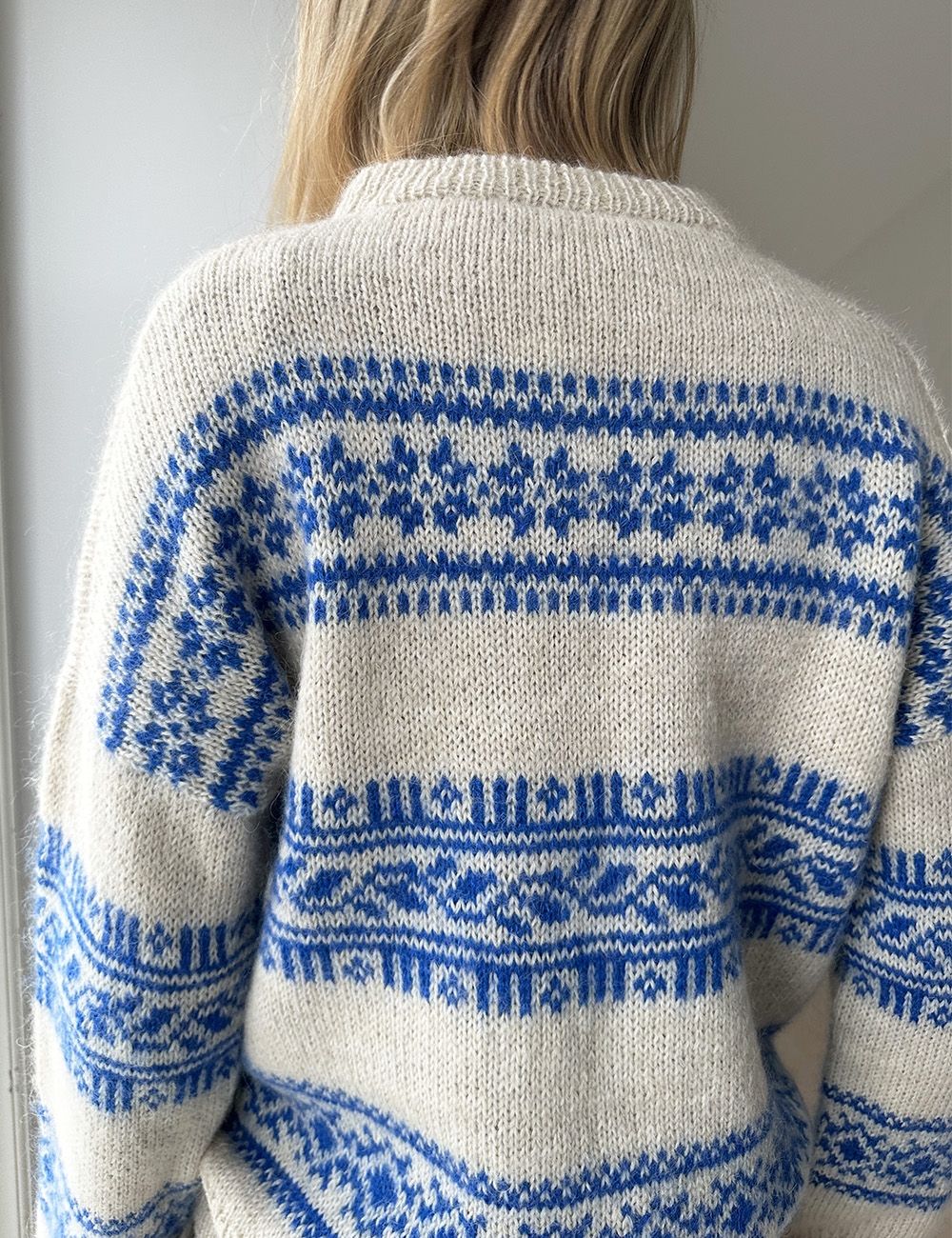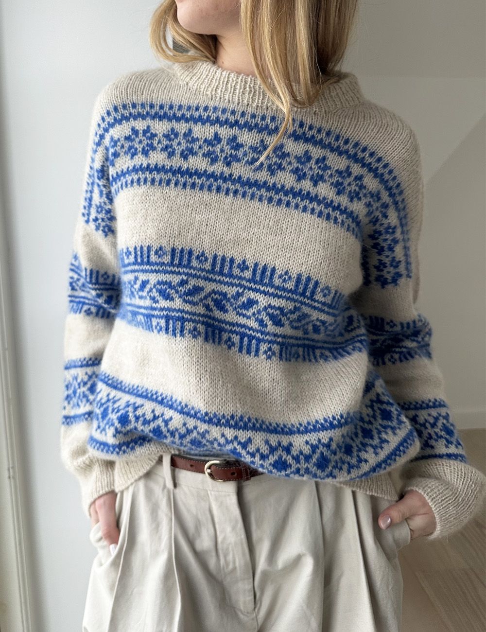 Ovenfra og ned: Først strikkes bakstykket øverste del fra de skrå skuldrene og ned til bunnen av ermehullene. Deretter strikkes forstykkets øverste del med skrå skuldre og halsutringning. Du kan velge om du vil strikke skuldrene med vendepinner eller legge opp masker som til bakstykket, og senere sy skuldersømmene sammen. Det er forklaring til begge deler. Når øverste del på både bakstykke og forstykke er strikket, samles de to delene og bolen strikkes ferdig rundt på rundpinne. Nå strikkes masker opp langs ermehullet og ermet strikkes på strømpepinner (eller ved hjelp av magic loop) ovenfra og ned. Til slutt strikkes det masker opp til halskant langs halsutringningen, og halskanten strikkes og brettes.