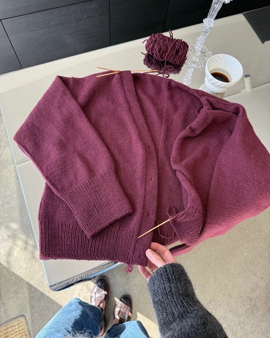 Den skarlagenrøde cardiganen strikkes ovenfra og ned med en rekke hevede rettmasker nedover midten av ryggen, og langs begge sider av kroppen, samt nedover undersiden av begge ermene. Den første delen av bakre bærestykke strikkes flatt, frem og tilbake, mens skuldrenes helling formes med vendepinner. Deretter strikkes en i-cord-kant langs oppleggskanten på bakre bærestykke. Maskene til hver av skuldrene plukkes opp og strikkes langs denne i-cord-en, og skuldrene strikkes separat flatt, frem og tilbake. Skuldrene strikkes med økninger til V-hals. For- og bakbærstykket samles til kroppen, som strikkes frem og tilbake på rundpinne. Ermene strikkes fra masker som plukkes opp og strikkes langs ermehullene. Til slutt plukkes det opp masker og strikkes langs forkantene, og en dobbel strikket forpinne strikkes.