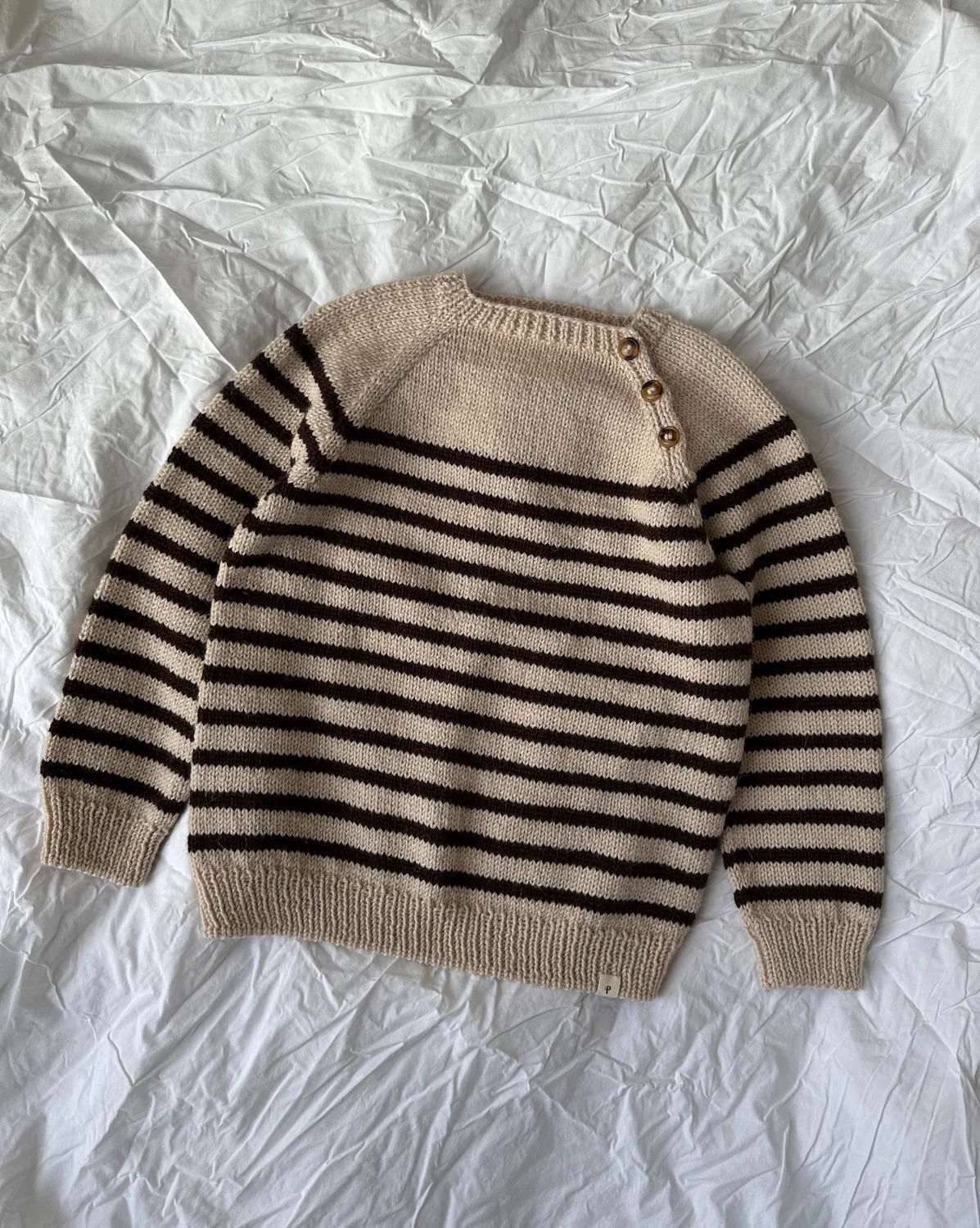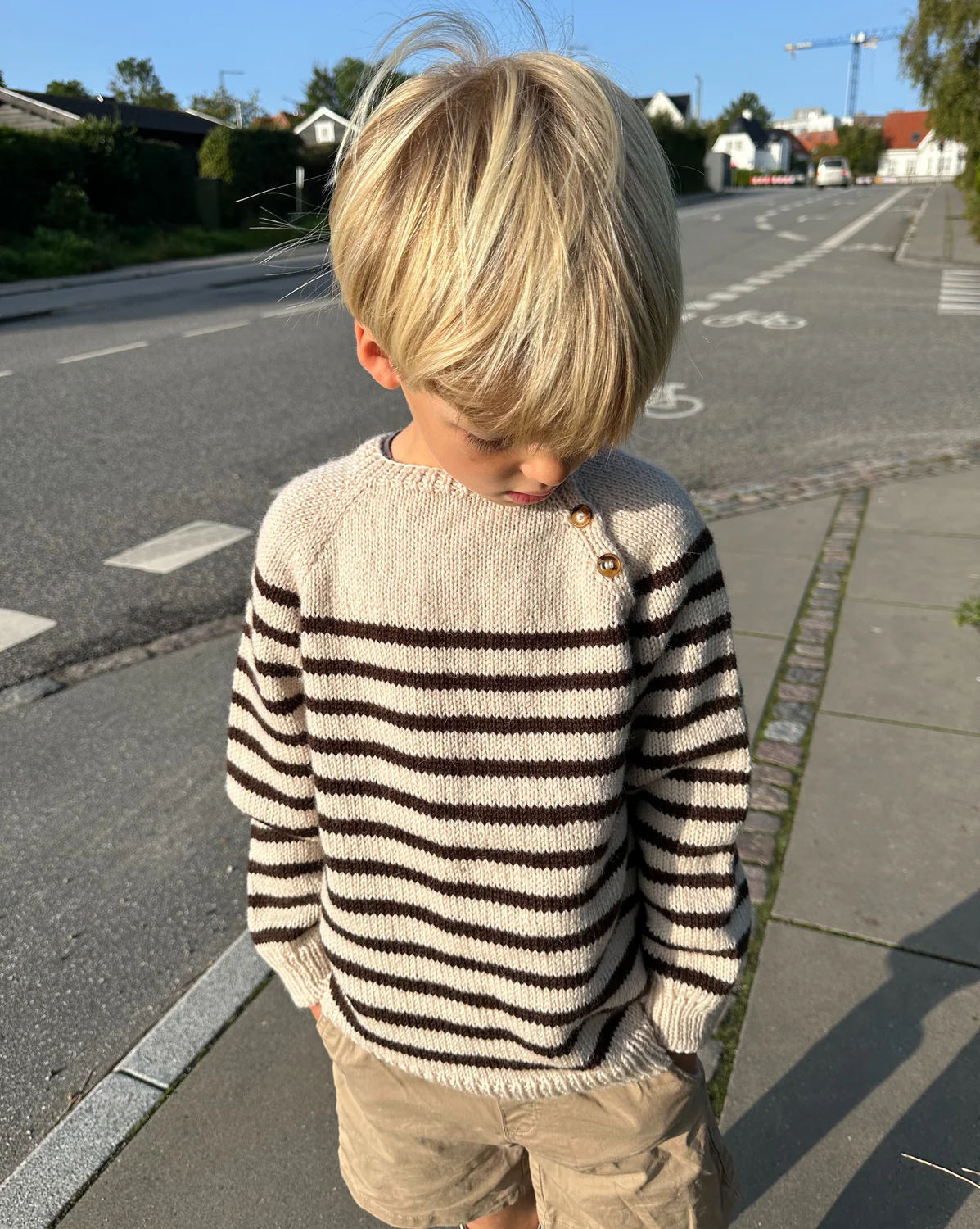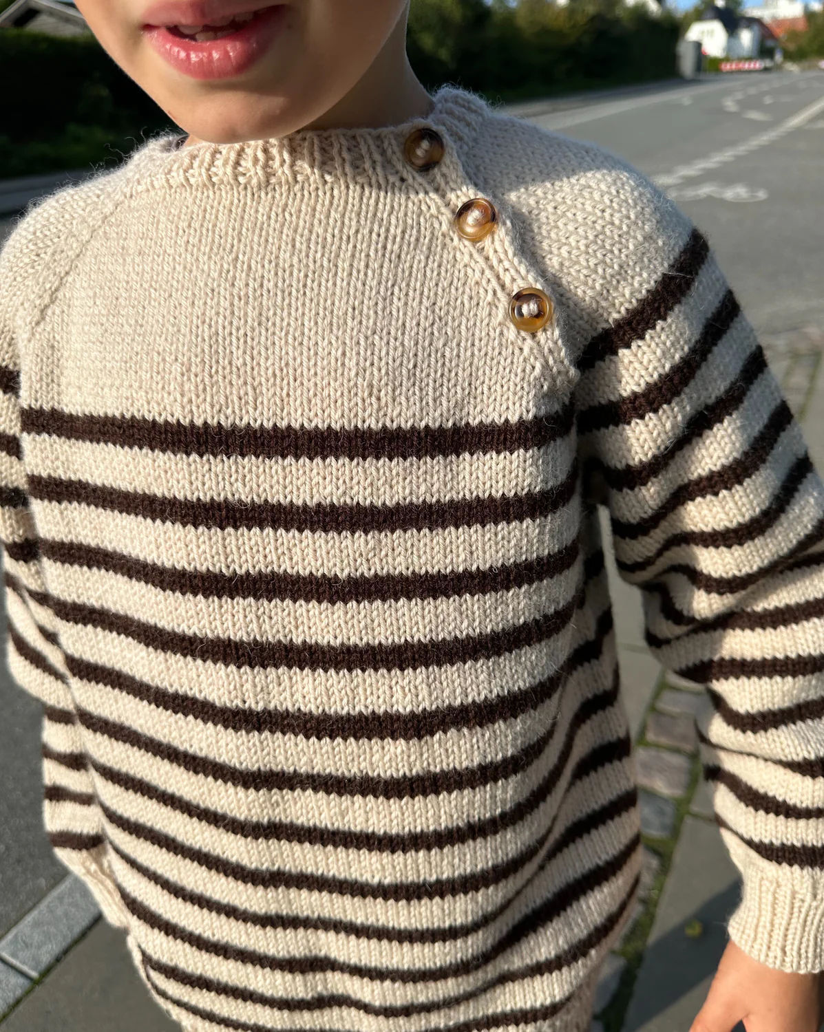 Den hvite og mørkebrune Seaside Sweater er strikket i Peer Gynt fra Sandnes Garn i fargene Almond [2511] og Cacao nibs [3091].