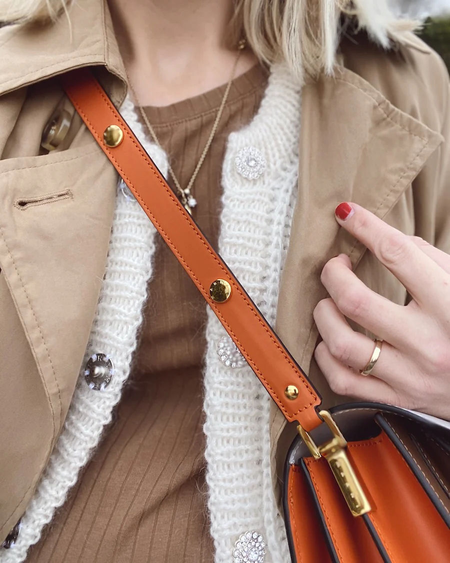 Den brune September Jakke er strikket i Sunday fra Sandnes Garn i fargen Chocolate truffle [2564] sammen med Tynn Silk Mohair fra Sandnes Garn i fargen Gyllenbrun [2755].