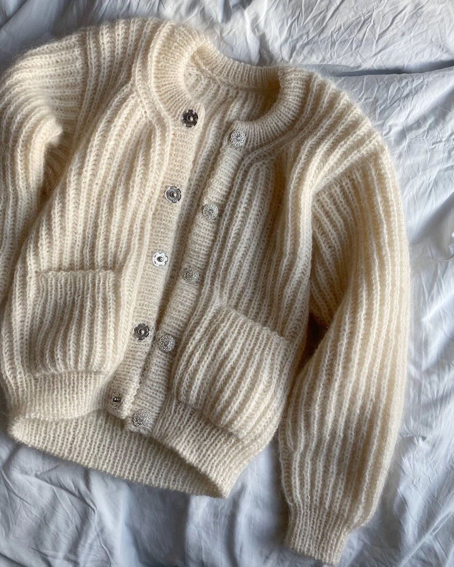 Den hvite September Jakke er strikket i Sunday fra Sandnes Garn i fargen Whipped cream [1012] sammen med Tynn Silk Mohair fra Sandnes Garn i fargen Natur [1012].