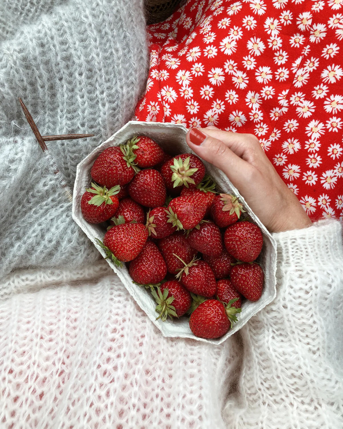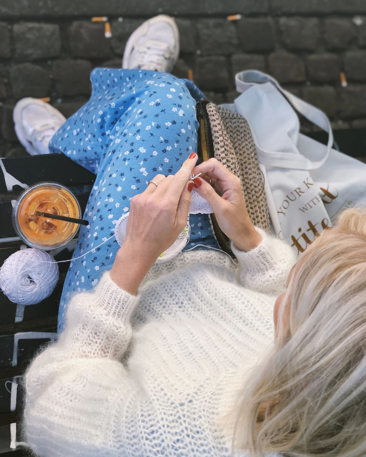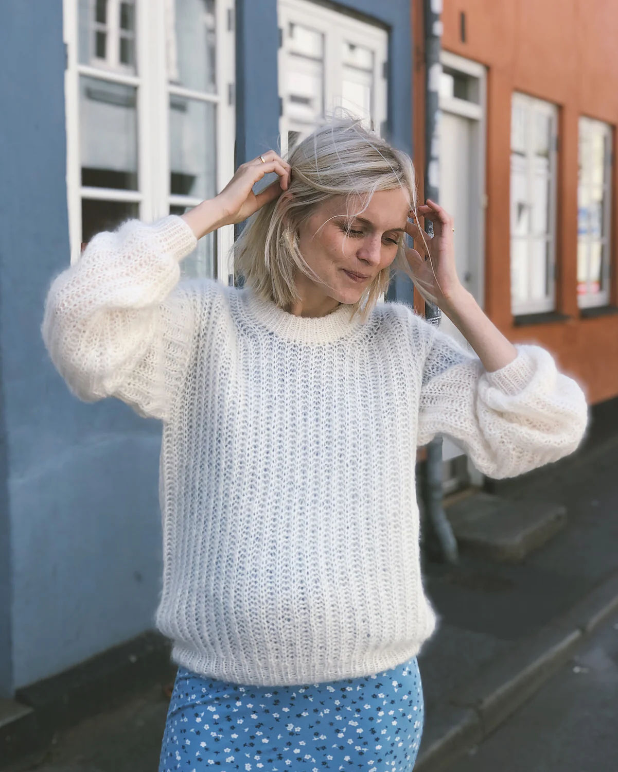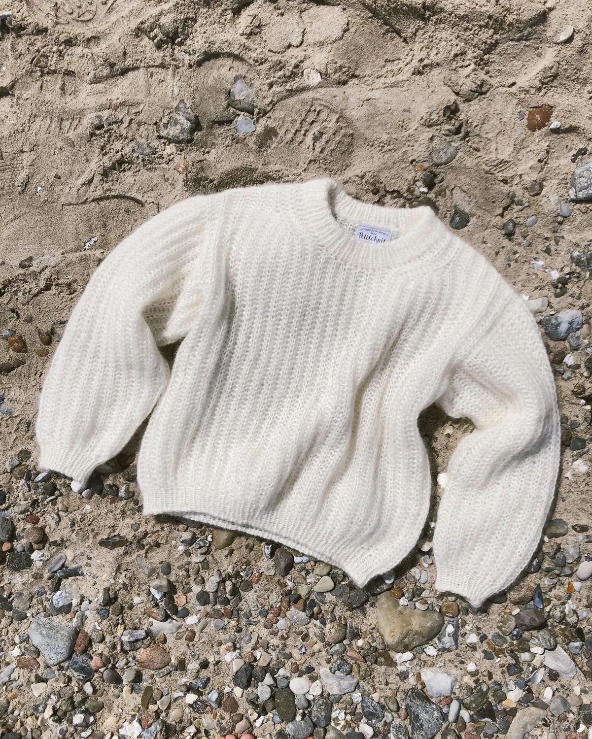 Den hvite September Sweater er strikket i Tynn Silk Mohair i fargen 1012 fra Sandnes Garn.