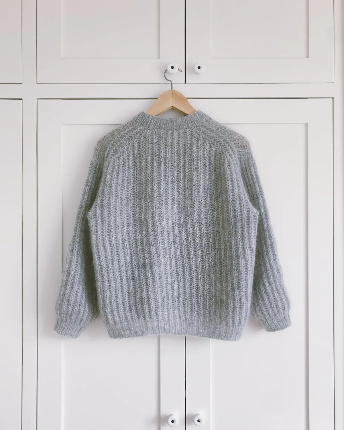 Den grå September Sweater er strikket i Tynn Silk Mohair i fargen lysegrå melert 1022 fra Sandnes Garn
