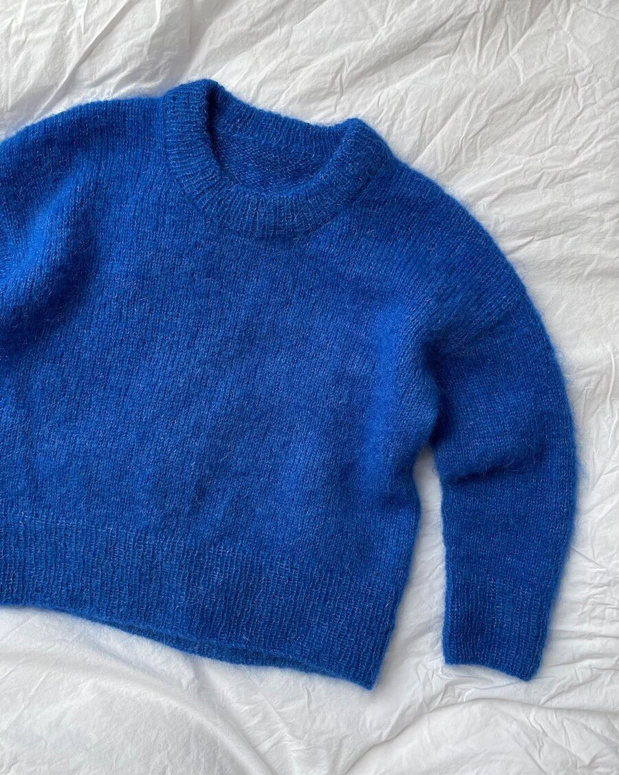 Den blå Stockholm Sweater Junior er strikket i Tynn Silk Mohair fra Sandnes Garn i fargen Jolly blue [6046].