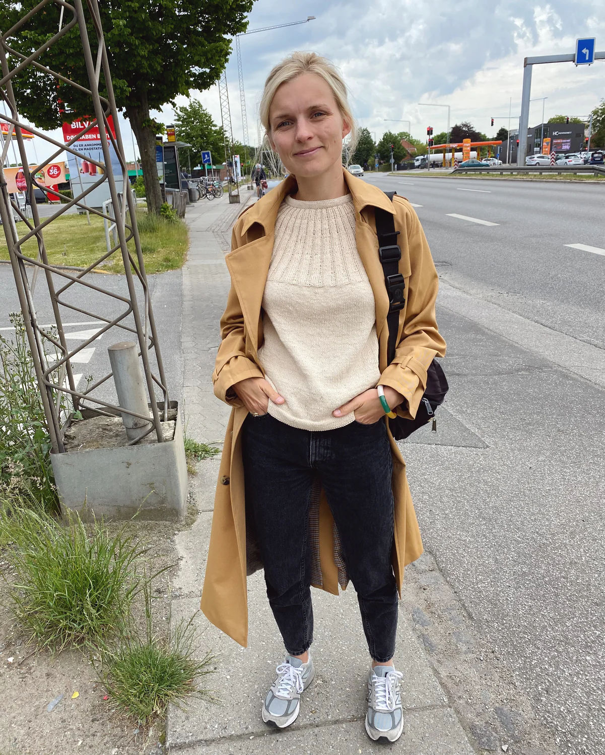 Garnforslag: 200 (250) 250 (300) 300 (350) 350 (350) 400 g Merci fra Filcolana (50 g = 200 m) eller Sunday fra Sandnes Garn (50 g = 235 m) eller Elise fra Permin (25 g = 115 m)