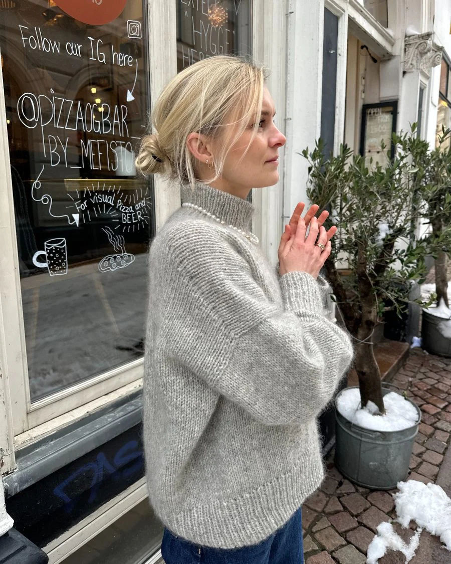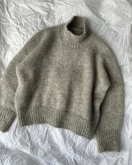 Materialer: 500 (500) 500-600 (600) 600 (600) 700 (700) 800 g Vidde fra Hillesvåg Ullvarefabrikk (100 g = 200 m) eller Håndværksgarn fra Hjelholts Uldspinderi (100 g = 200 m) strikkes sammen med 100-125 (125) 125 (125) 125 (125) 150 (175) 175 g Soft Silk Mohair fra Knitting For Olive (25 g = 225 m) eller Silk Mohair fra Isager Garn (25 g = 212 m)